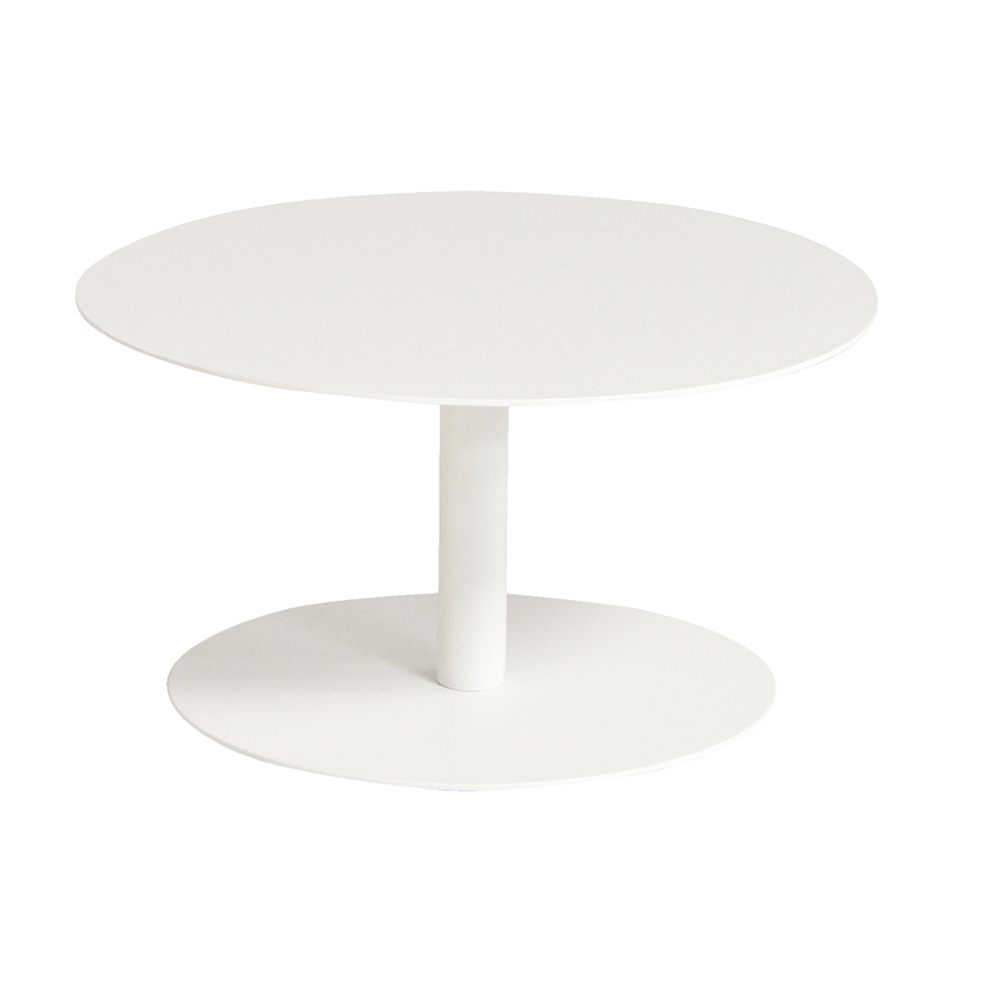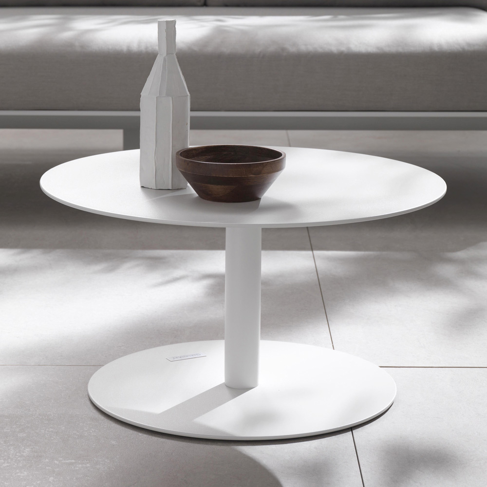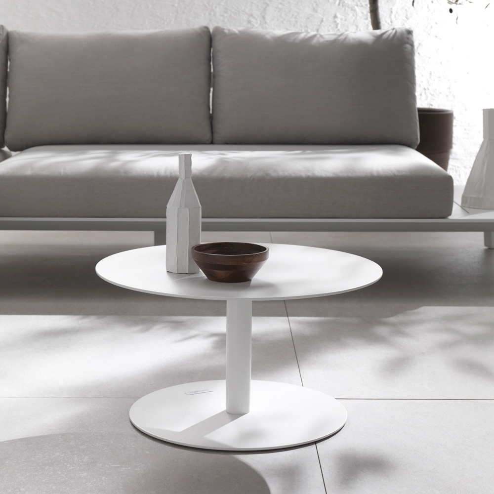 Odkládací stolek na zahradu tvořený deskou a konstrukcí z hliníku natřeného epoxidovými prášky v bílé barvě. Tento konferenční stolek se vyznačuje měkkým, lineárním a jednoduchým designem a je ideální pro vybavení jakéhokoli venkovního prostředí, jako jsou terasy, bazény a zahrady, a zároveň nachází své místo v různých vnitřních obytných prostorech jako funkční opěrný bod.