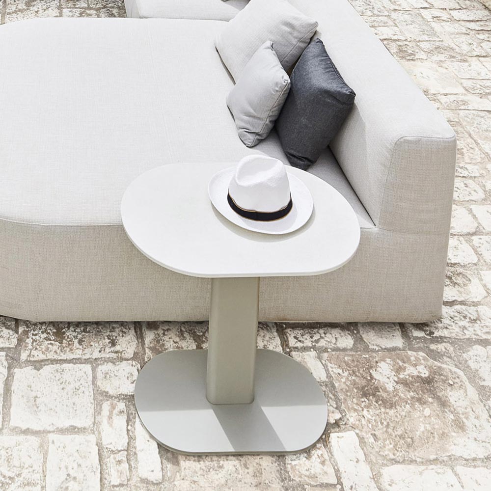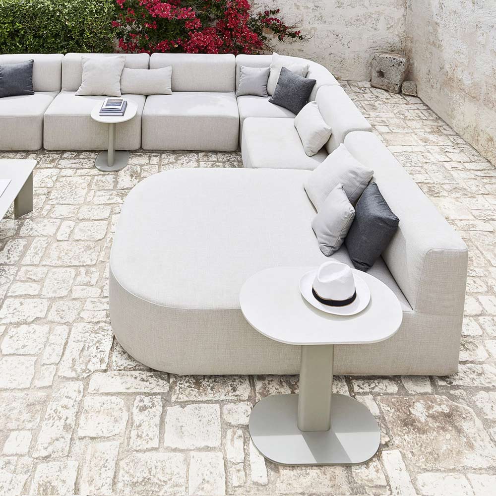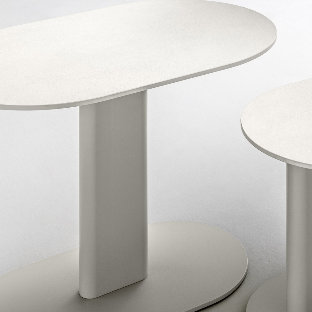 Zahradní konferenční stolek složený z hliníkové konstrukce spočívající na ocelové základně s ochranným cyklem v hedvábně šedé barvě a limetkově bílou HPL deskou , vyrobený v Itálii. Díky svému lineárnímu, čistému a funkčnímu designu je tento konferenční stolek ideální pro zdobení venkovního prostředí, jako jsou terasy, bazény a zahrady, a nachází své místo také v různých vnitřních obytných prostorech.