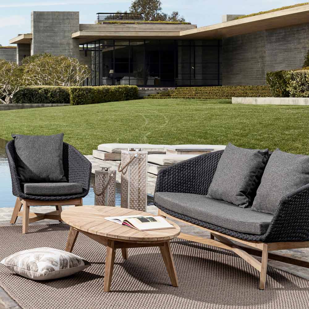 Venkovní konferenční stolek z teakového dřeva s oválnou deskou.