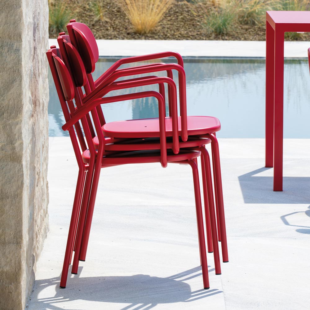 Stohovatelná venkovní židle z práškově lakovaného pozinkovaného železa s područkami. Vyrobeno v Itálii, 4 kusy.