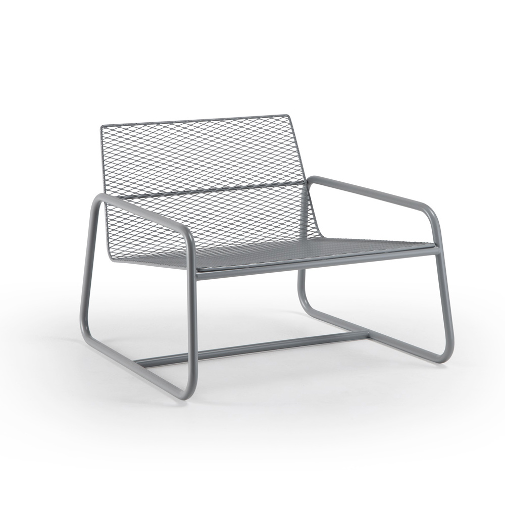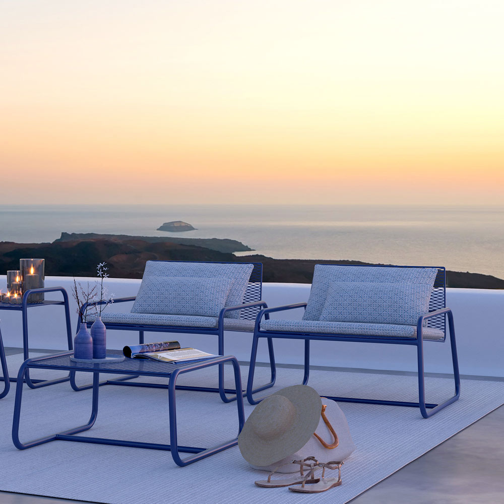 Venkovní kovové křeslo s koordinovanými látkovými polštáři, vysoce kvalitní vyrobené v Itálii.