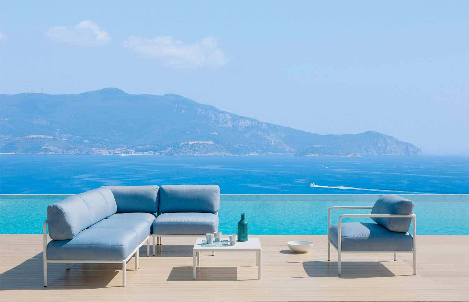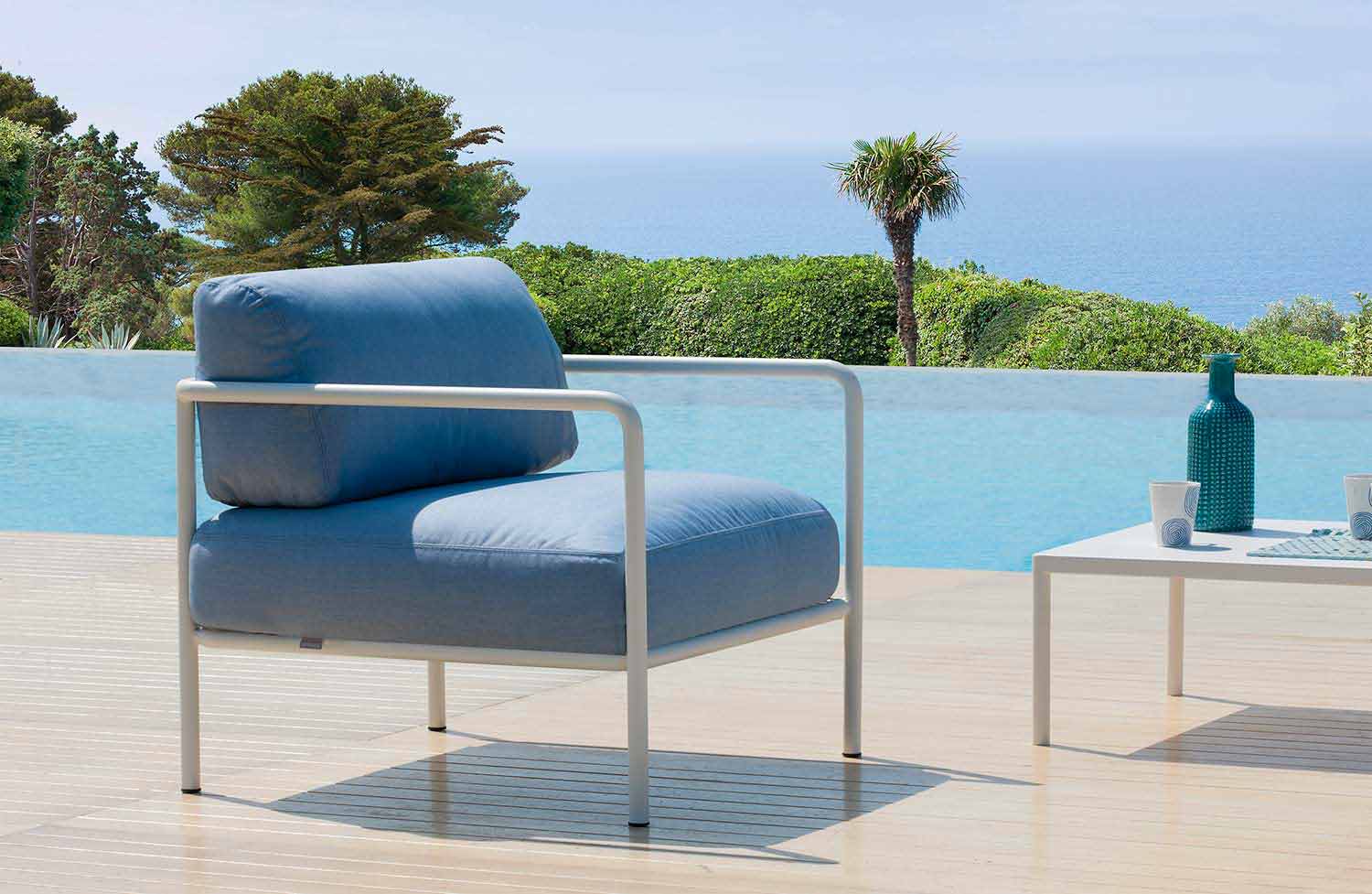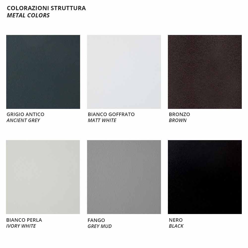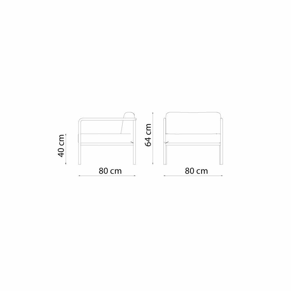 práškově lakovaného pozinkovaného plechu natřeného termosetovými prášky, zatímco sedák a opěradlo jsou vyrobeny ze 100% barvené akrylové tkaniny. Tyto dva materiály použité společně dodávají výrobku robustnost, aniž by zanedbávaly vizuální a dekorativní aspekt. Je ideální pro doplnění venkovního vybavení, které vyžaduje eleganci a osobitost, a to díky minimalistickým liniím, které z něj činí předmět s jedinečným designem.