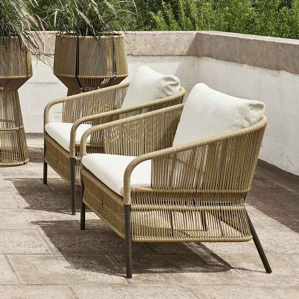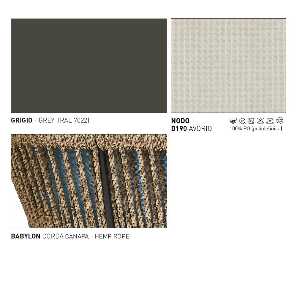 Venkovní křeslo s konstrukcí z hliníku s práškovým nástřikem a šedým povrchem , ručně tkaným sedákem z konopného lana a dvěma polštáři v barvě slonové kosti s polstrováním Dryfeel . Inovativní a svěží řešení nábytku obohacené o nádherné povrchové úpravy, které rafinovaně transformují venkovní prostředí.