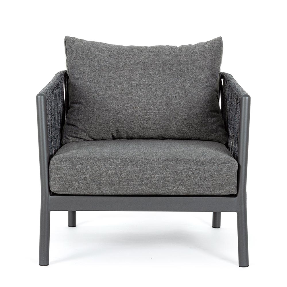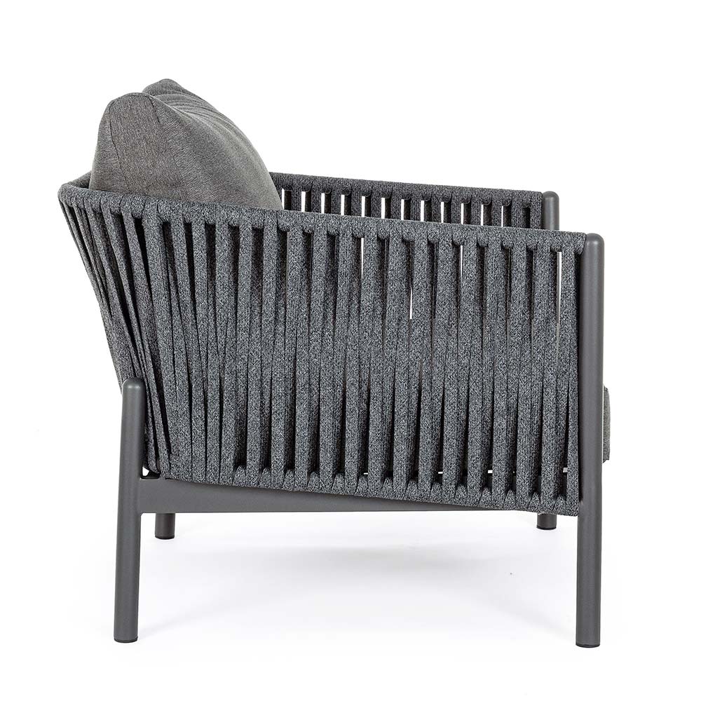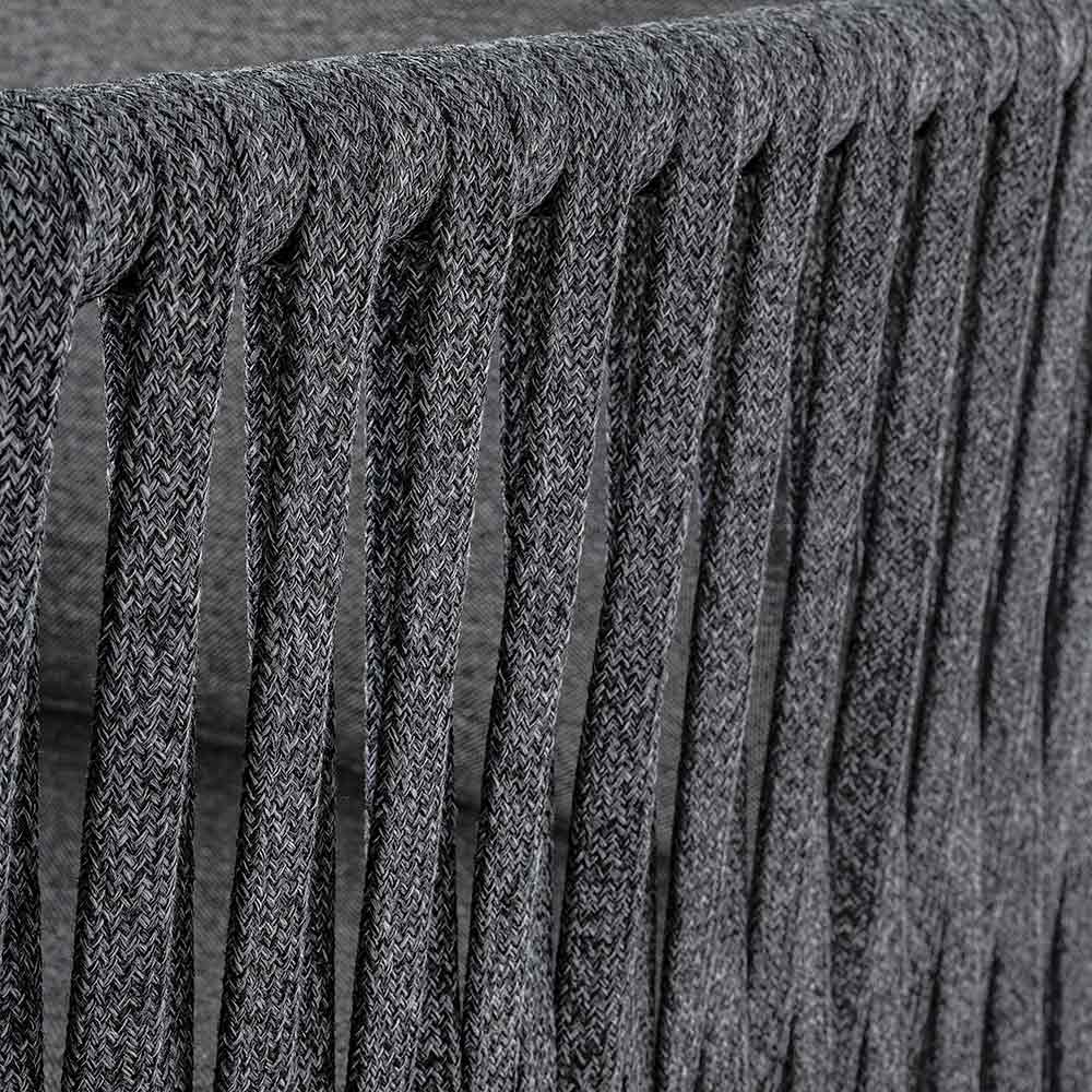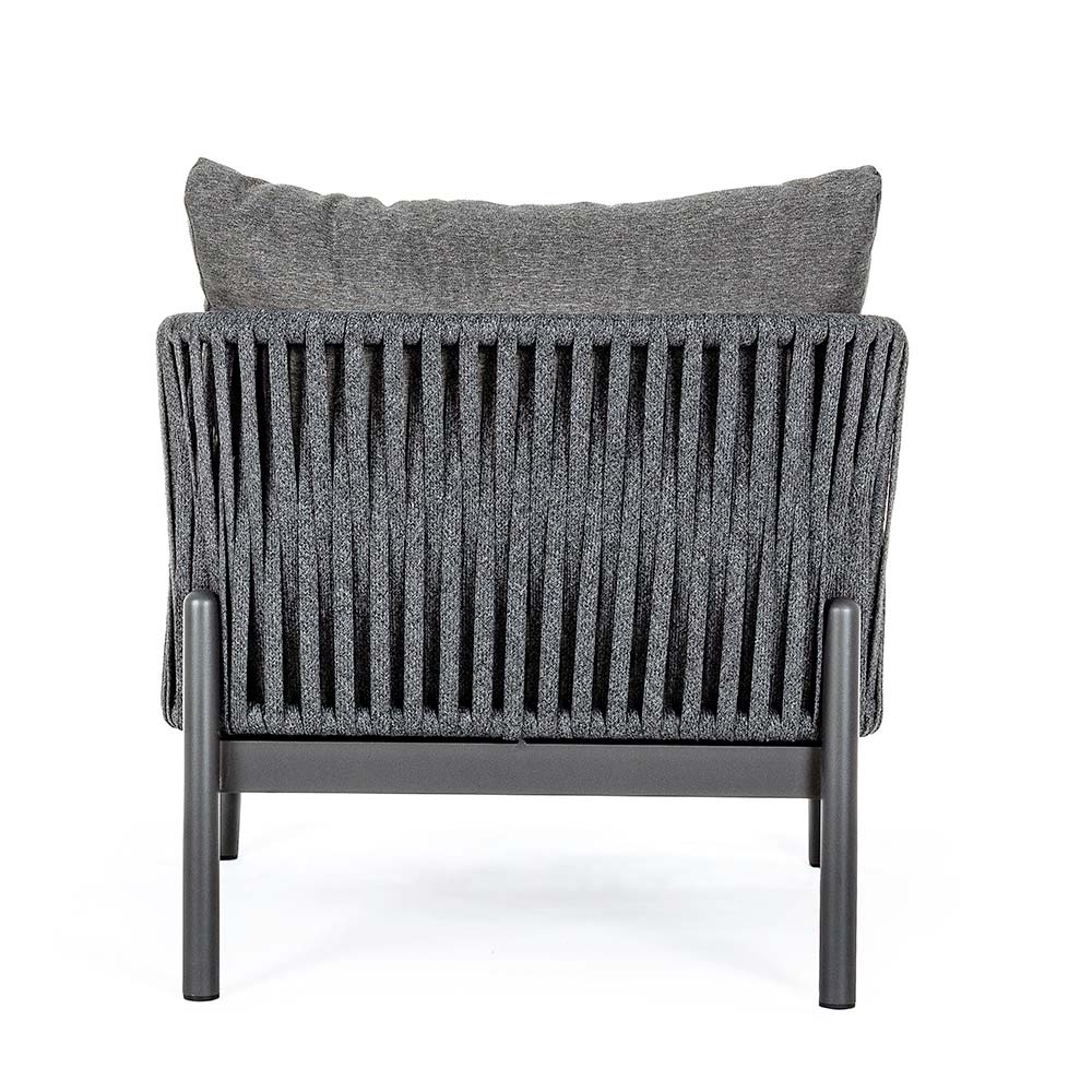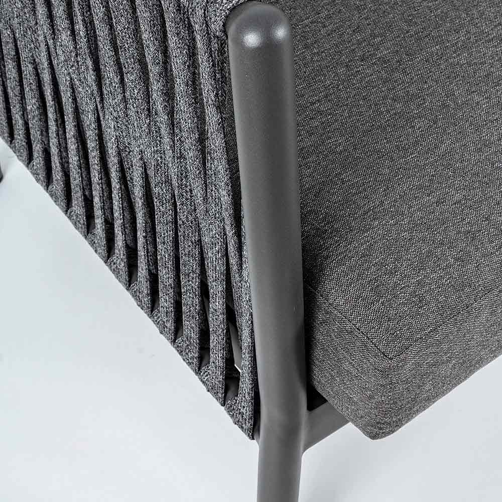 Venkovní křeslo s hliníkovou konstrukcí a provazem tkané opěradlo.