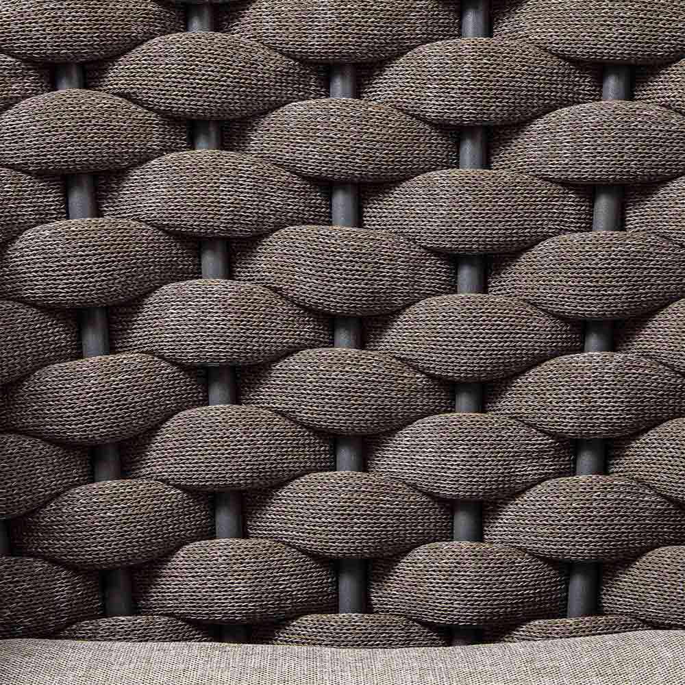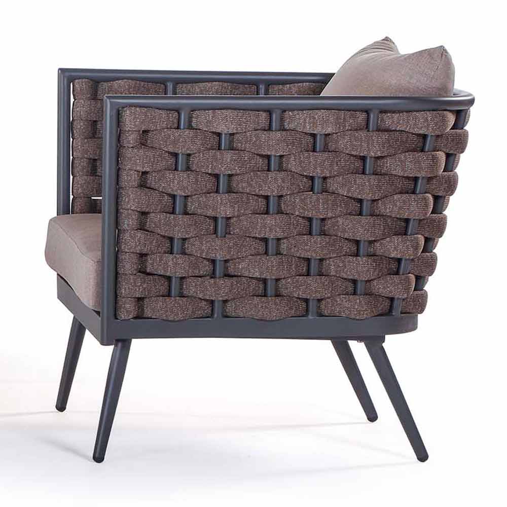 Venkovní křeslo vyrobené z lakované hliníkové konstrukce s grafitovou povrchovou úpravou a tkaní polyesterového lana s polštáři sedáku a opěradla potaženými hnědou akrylovou látkou . Sedačka pro venkovní prostředí, která kombinuje funkčnost a příjemný estetický vzhled, čímž dokáže nabídnout dokonalé řešení vybavení pro ty, kteří hledají produkt, který je stejně pohodlný a příjemný, protože je elegantní a schopný vytvořit úžasnou harmonii s ostatními prvky nábytek kolem.