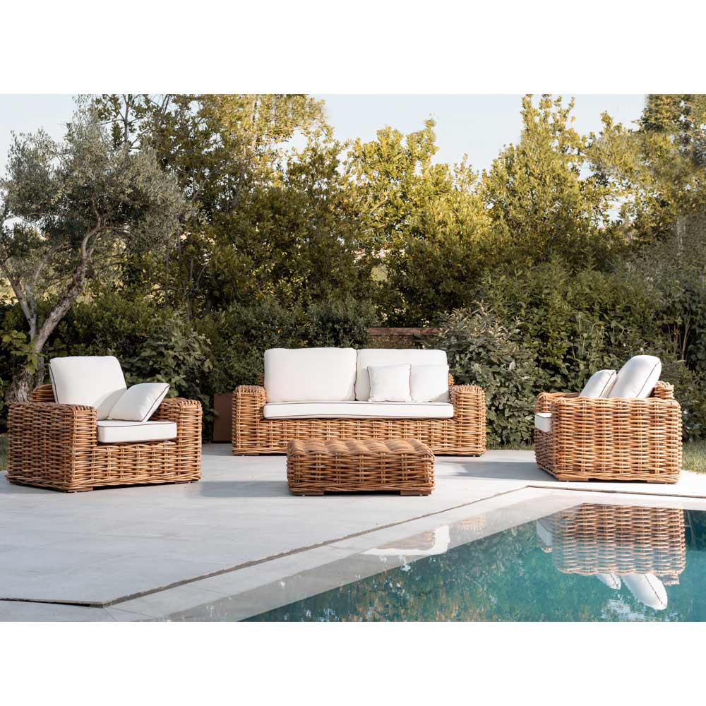 Venkovní křeslo vyrobené z přírodního ručně tkaného ratanu v přírodní barvě Jungle s polštáři v ceně ve standardním provedení "Ecru" a s lemováním "chocolate".