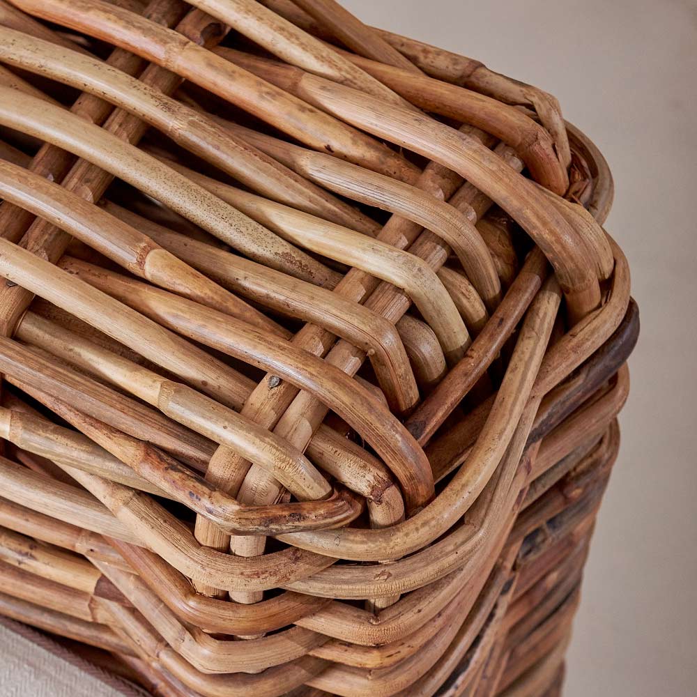 křeslo patří do celé kolekce, která vyniká čtvercovým tvarem rámů, potažených rustikálním výpletem se silným estetickým účinkem. ruční zpracování a použití speciálního druhu přírodního ratanu s duhovými tóny - který připomíná tóny podzimu a podrostu - dodává jedinečnost každému kusu.