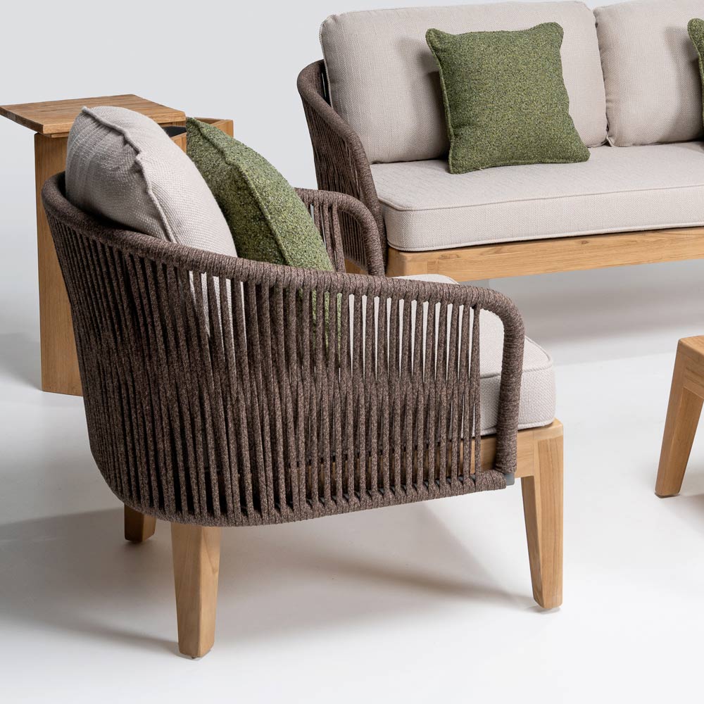 Venkovní křeslo z teakového dřeva a polyratanového výpletu s polštáři.