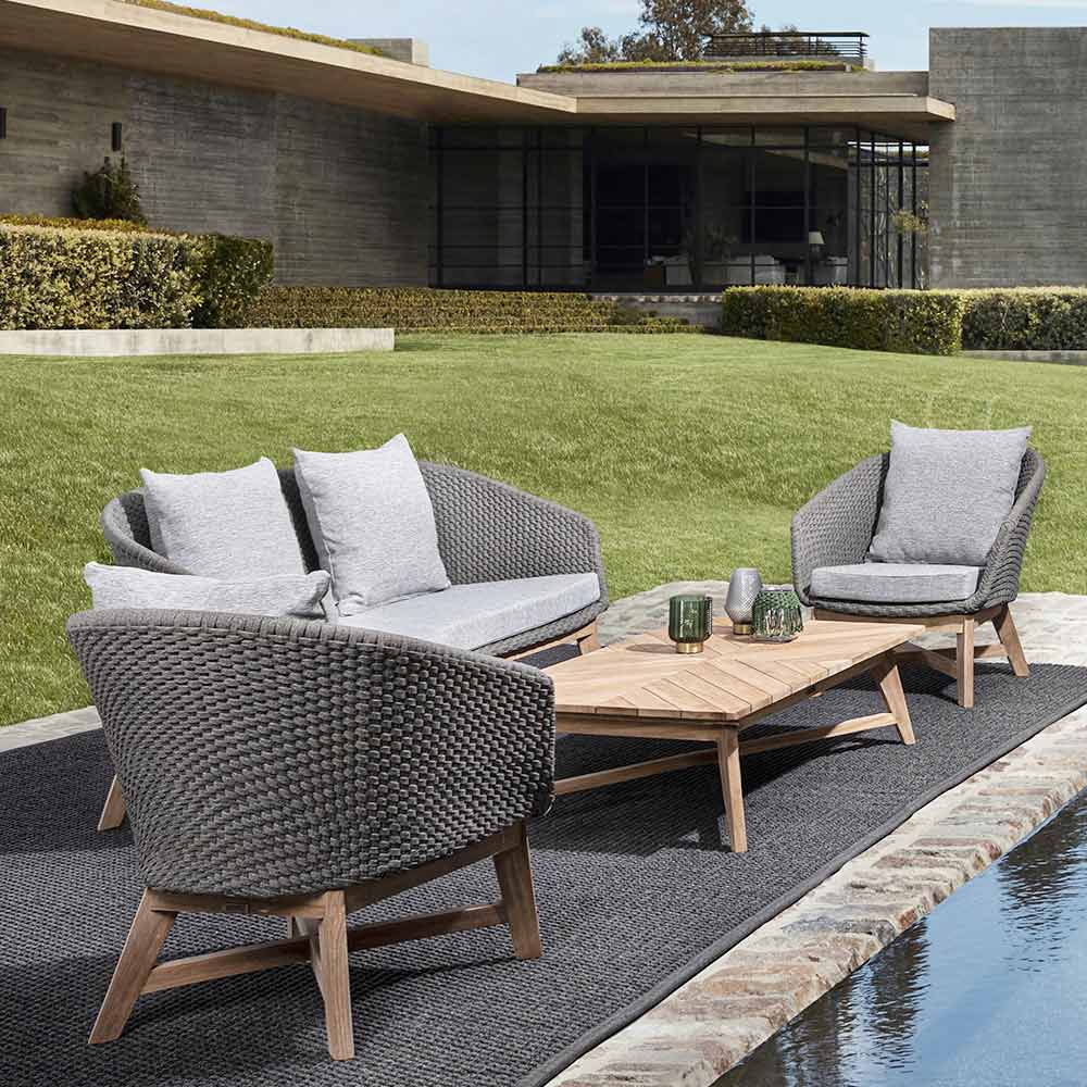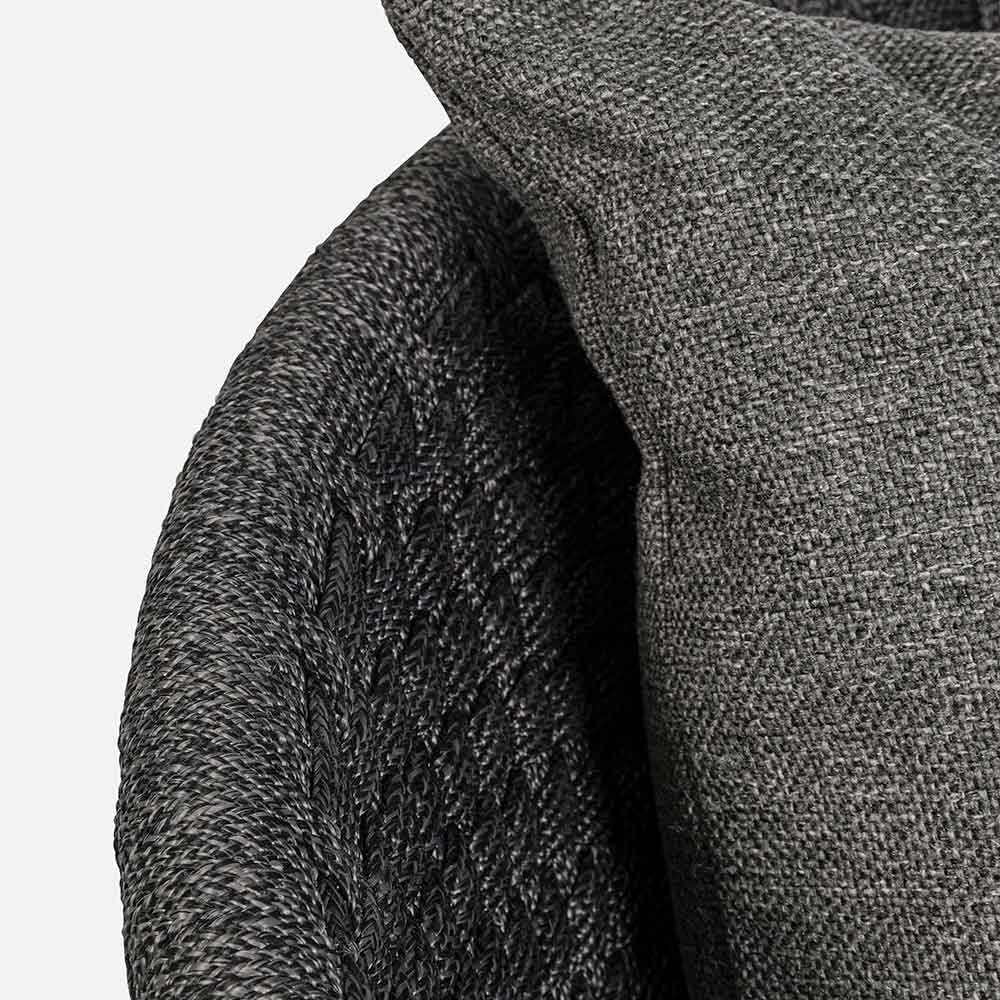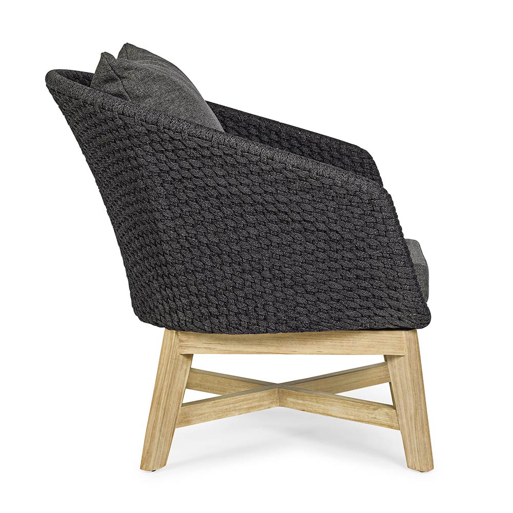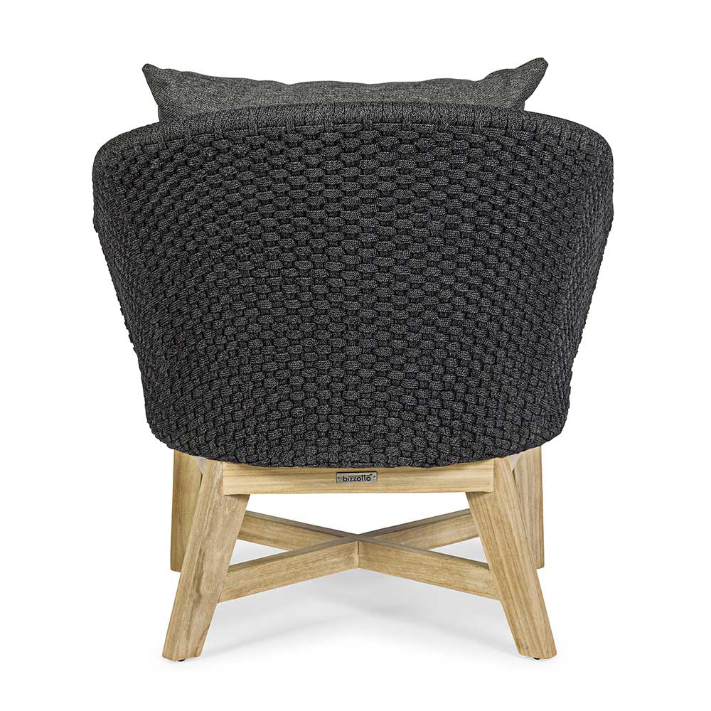 Luxusní venkovní křeslo z tkaného lana s odnímatelnými látkovými polštáři.