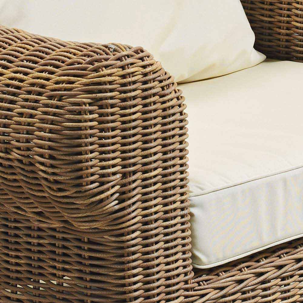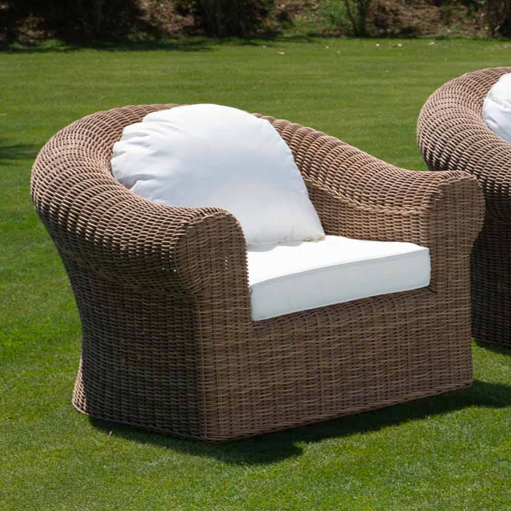 Zahradní křeslo ze vzácného přírodního tkaného syntetického ratanu a bílé nebo ecru tkaniny.