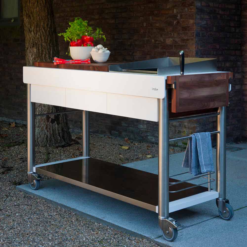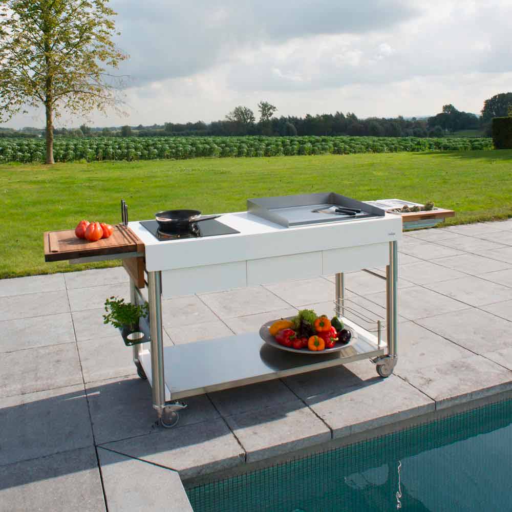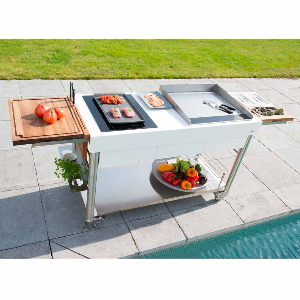 Jedná se o venkovní kuchyni na kolech, která se vyznačuje robustní konstrukcí, která používá kartáčovanou nerezovou ocel, povrchové úpravy a vrchní část vysoce kvalitního kompozitu s obložením z masivního dřeva Ořech, můžete umístit tam, kam dáváte přednost: na zahradě, na terase nebo u bazénu, pro luxusní a módní efekt.