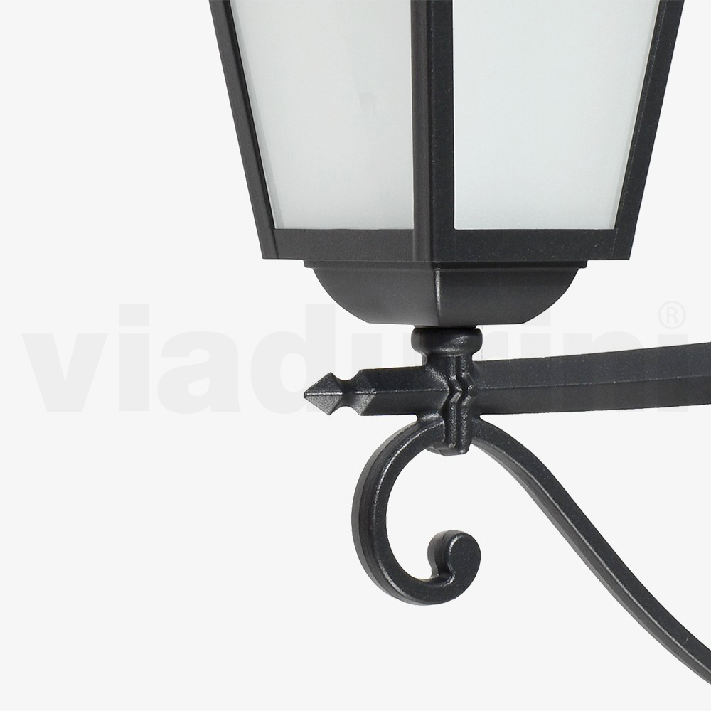Zahradní lampa vyrobená z tlakově litého hliníku s antracitovou povrchovou úpravou a difuzorem z pískovaného skla , celá vyrobena v Itálii.