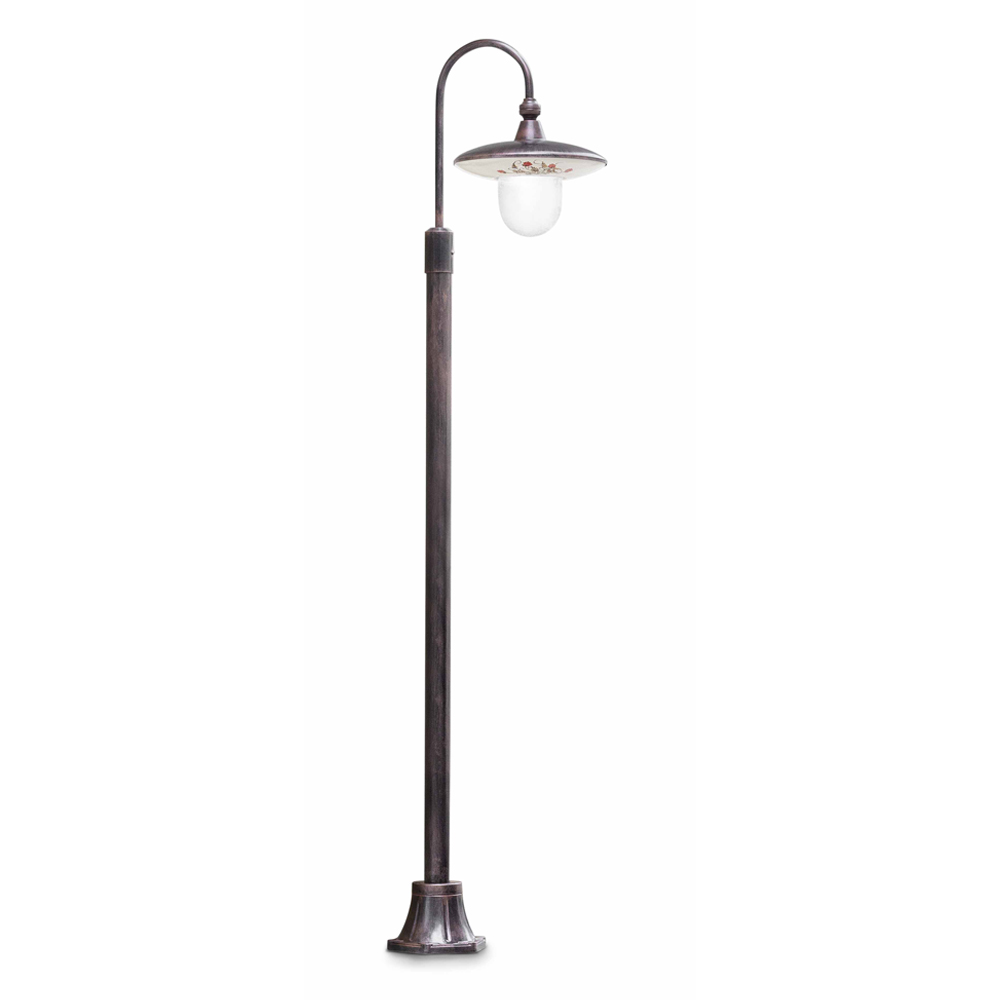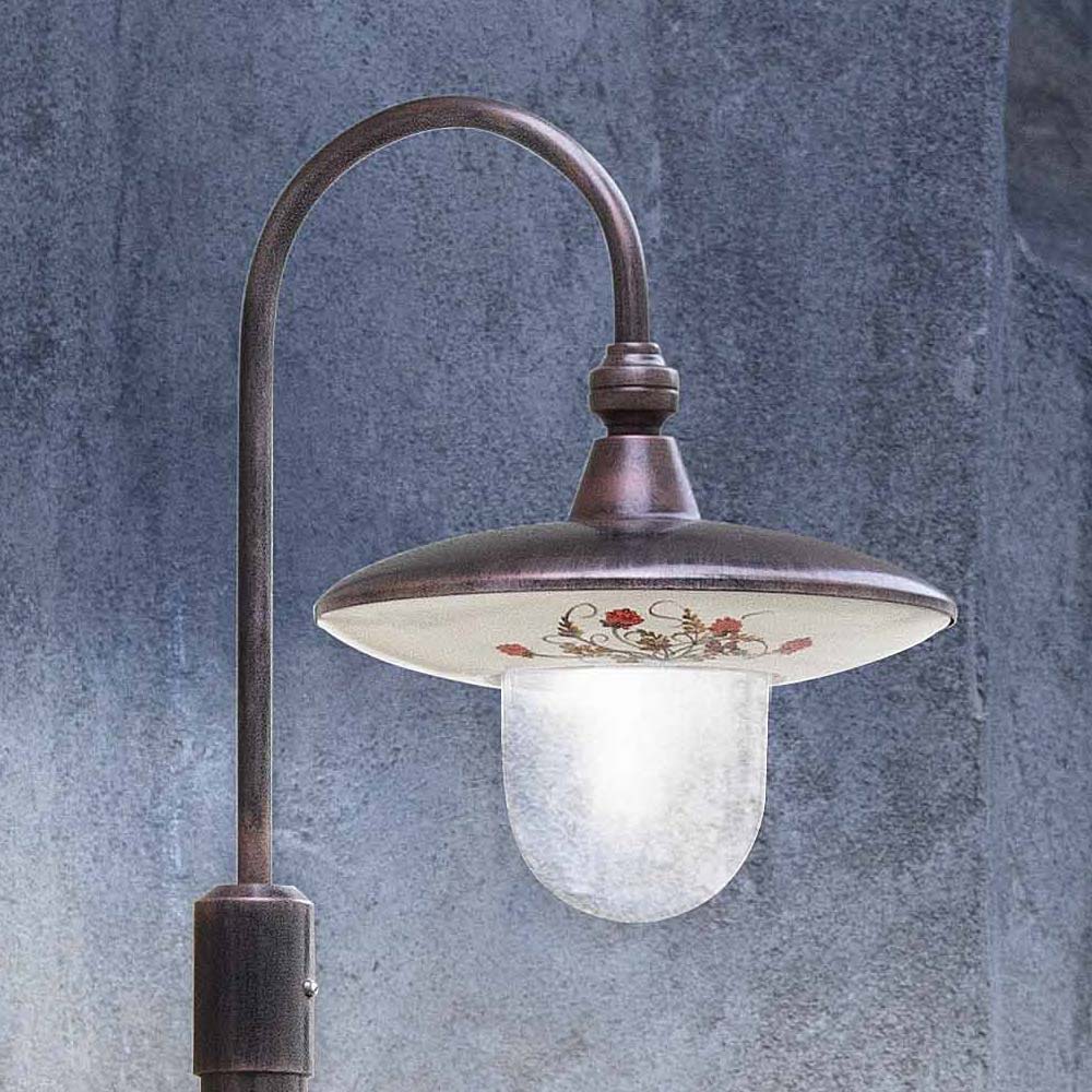 Tato zahradní lampa je celá vyrobena z černého hliníku s měděným stínidlem a zdobená ručně malovanými květinami pro klasický a harmonický styl mezi tvarem a barvami.