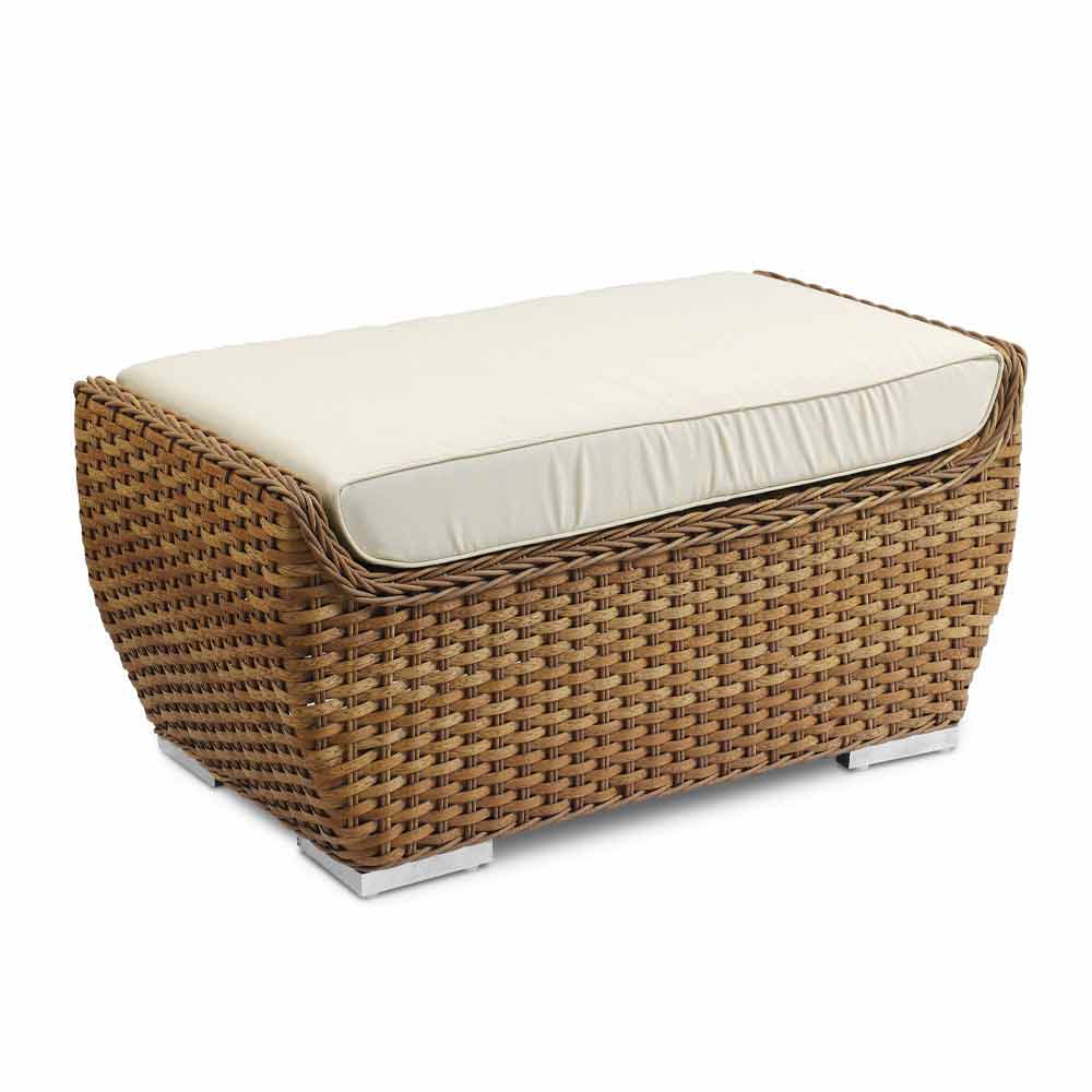 Pouf do zahrady z jemného luxusního tkaného syntetického ratanu a bílého nebo ekru polštáře.