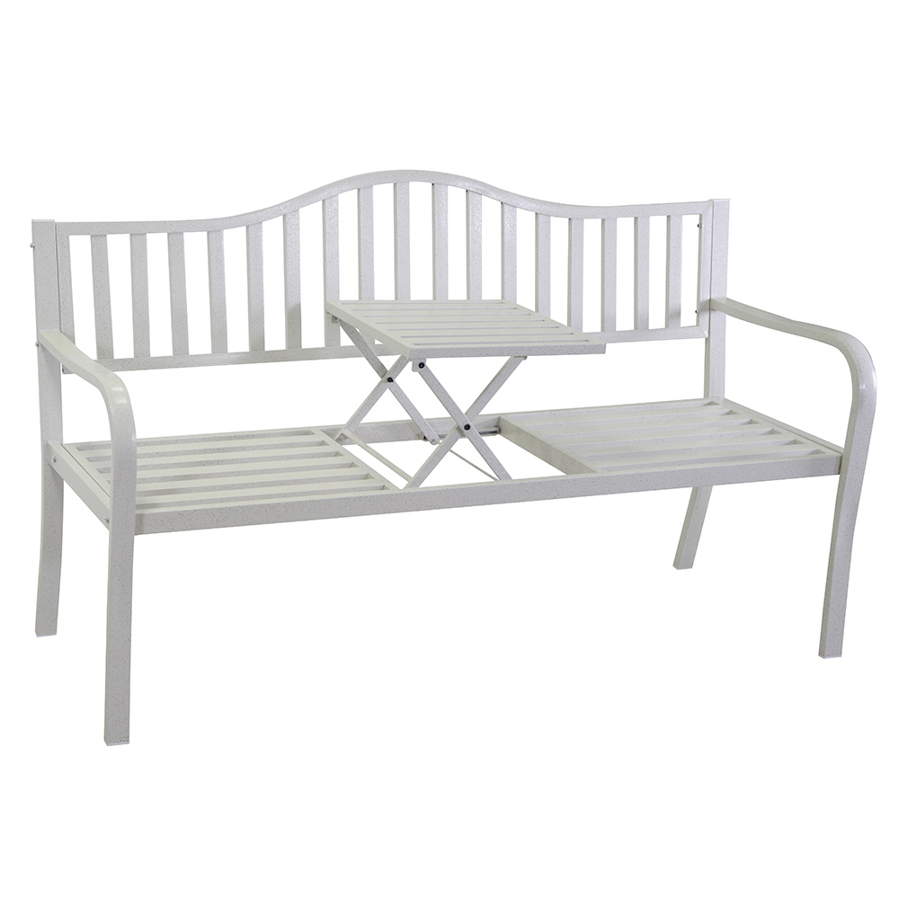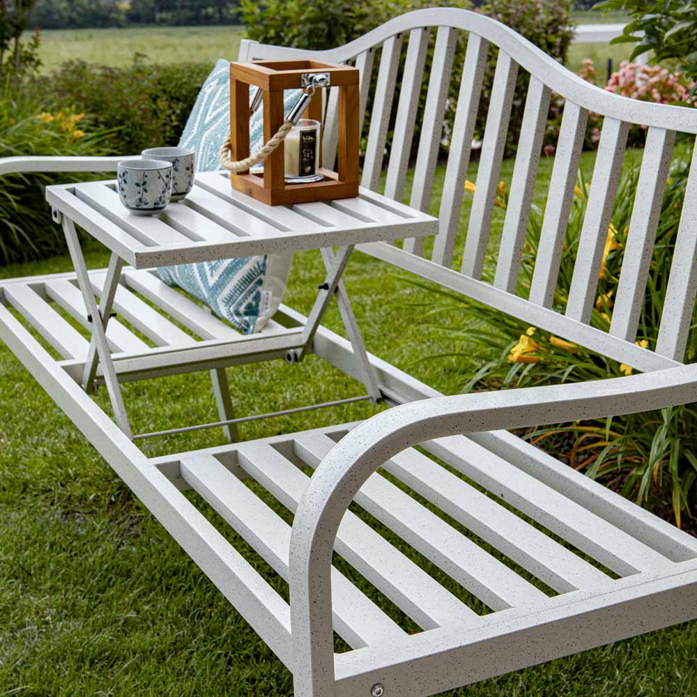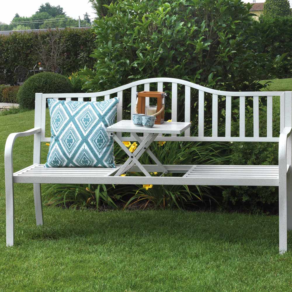 Bílá povrchová úprava se snadno sladí s jakýmkoli venkovním prostředím a dodá mu nádech moderního stylu. Vrcholem tohoto kusu je odkládací stolek , který je ideální pro odkládání nápojů, knih nebo drobných předmětů a během několika vteřin promění lavičku v praktický multifunkční prostor.