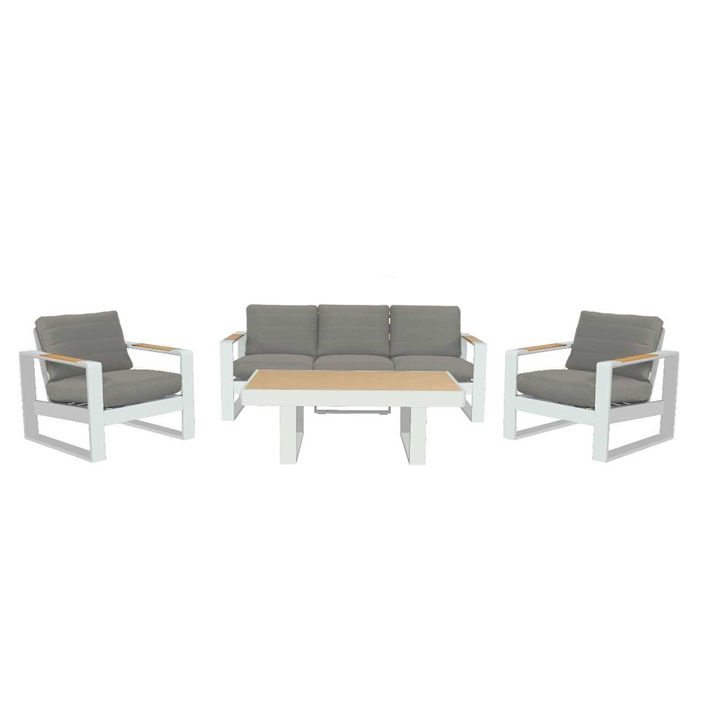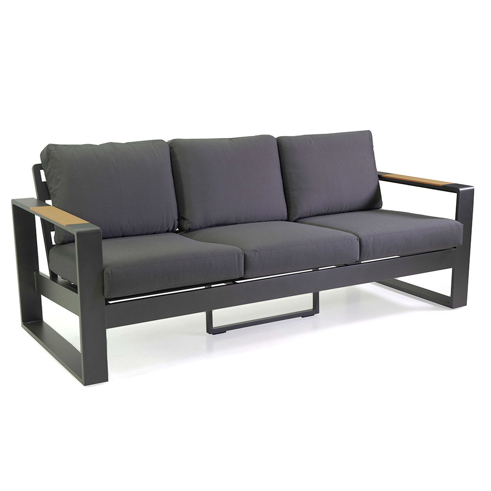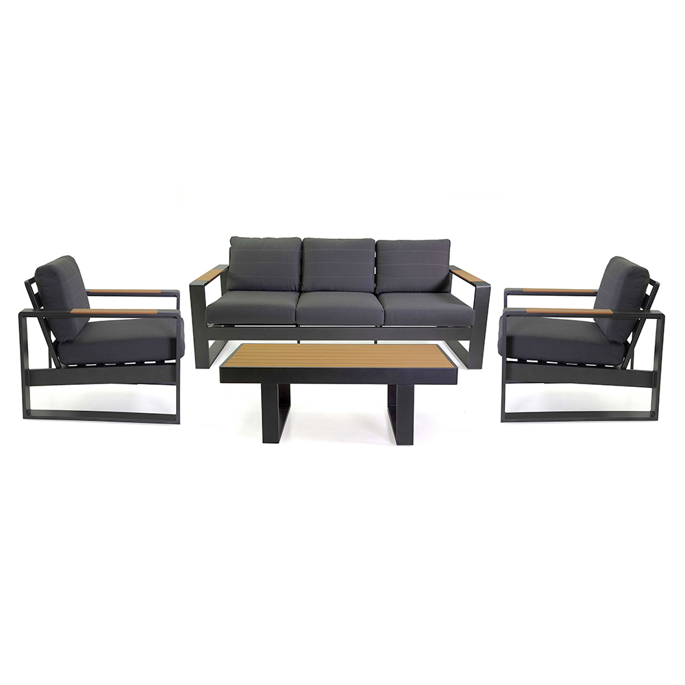 1 pohovky: práškově lakovaný hliníkový rám, polyesterové polštáře a područky z polywoodového dřeva v barvě s přírodním efektem dřeva.