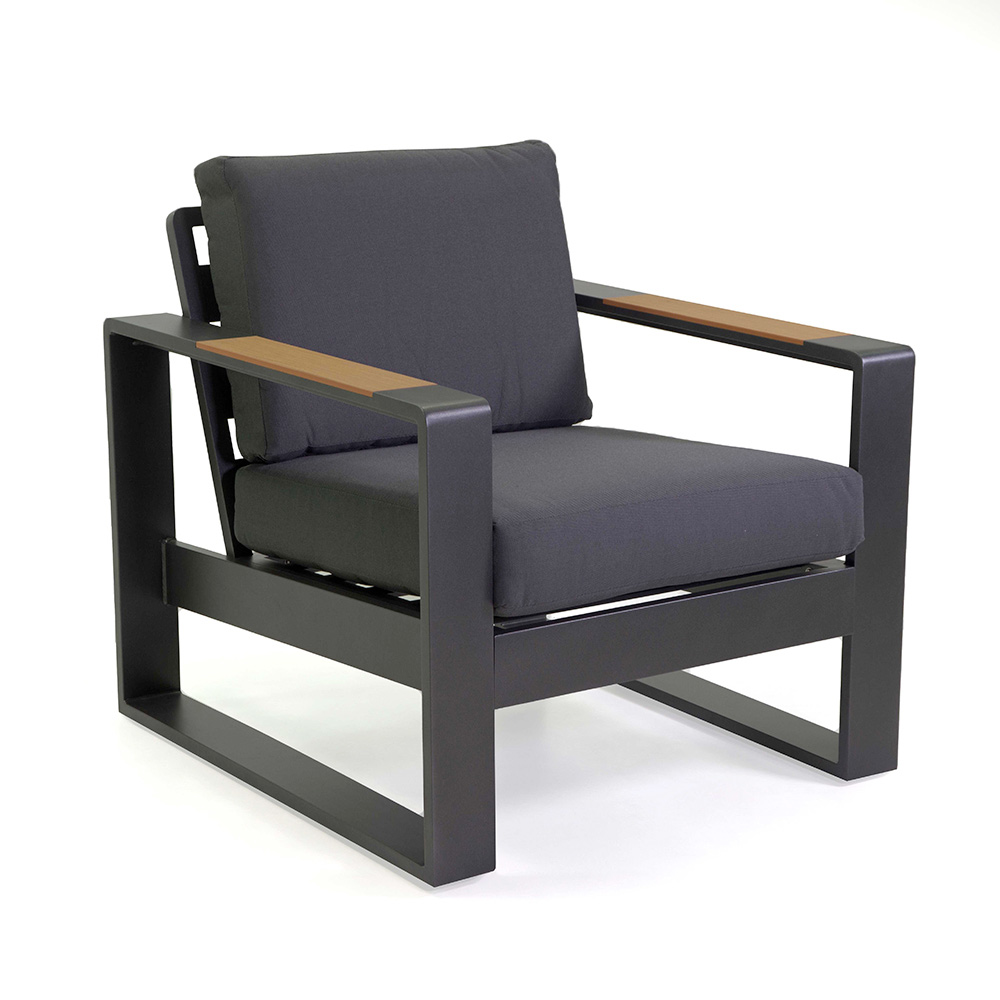 2 křesel: práškově lakovaný hliníkový rám, polyesterové polštáře a područky z polywoodového dřeva v barvě s přírodním efektem dřeva.