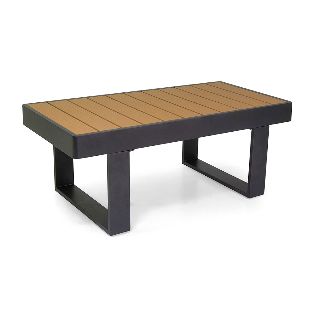 1 konferenční stolek: práškově lakovaný hliníkový rám a deska z polywoodového dřeva v barvě s efektem přírodního dřeva.