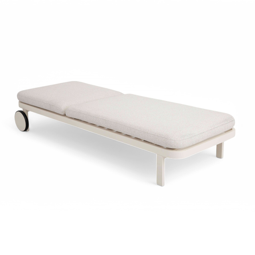 Minimalistický design je obohacen promyšlenými detaily, jako jsou integrovaná kolečka, díky nimž jej můžete snadno přemístit, kamkoli budete chtít, po chvílích odpočinku na slunci nebo ve stínu. Čalouněná matrace , potažená látkou odolnou proti povětrnostním vlivům , zaručuje mimořádné pohodlí a dlouhodobou odolnost.