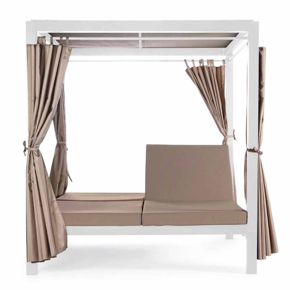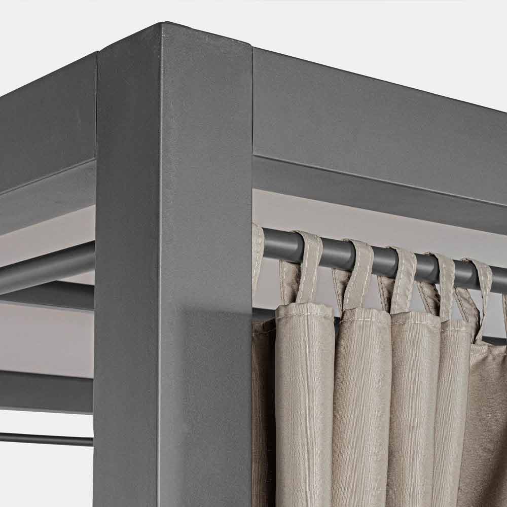 potažená hliníková konstrukce, tyče 80 x 80 mm , střešní tkanina a polštáře sedadel (odnímatelné) z textilu 1x1, rychleschnoucí pěnová výplň pro venkovní použití. 4polohová sklopná opěradla a