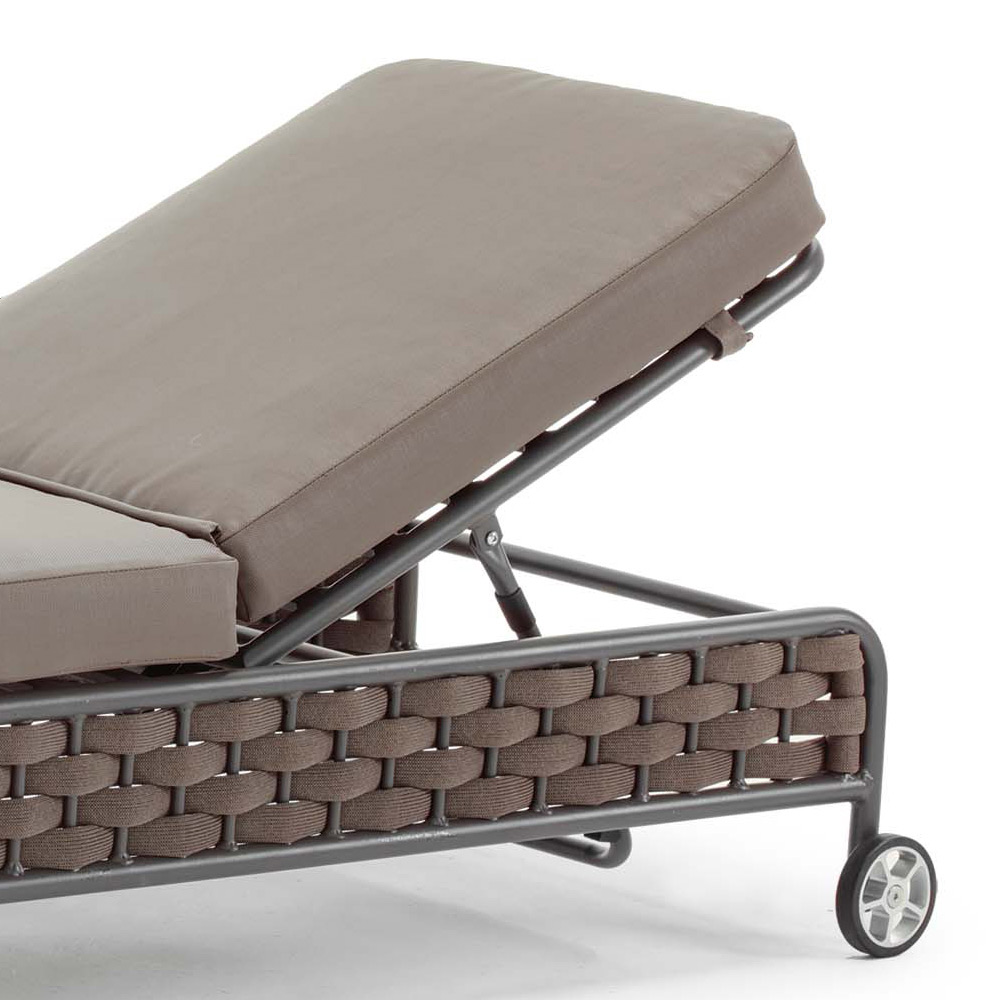 Zahradní lenoška s vnitřní strukturou z antracitově lakovaného hliníku obalená elegantní tkaninou z hnědého polyesterového provazu a odnímatelnými polštáři z vodoodpudivé gumy potažené hnědou akrylovou látkou .