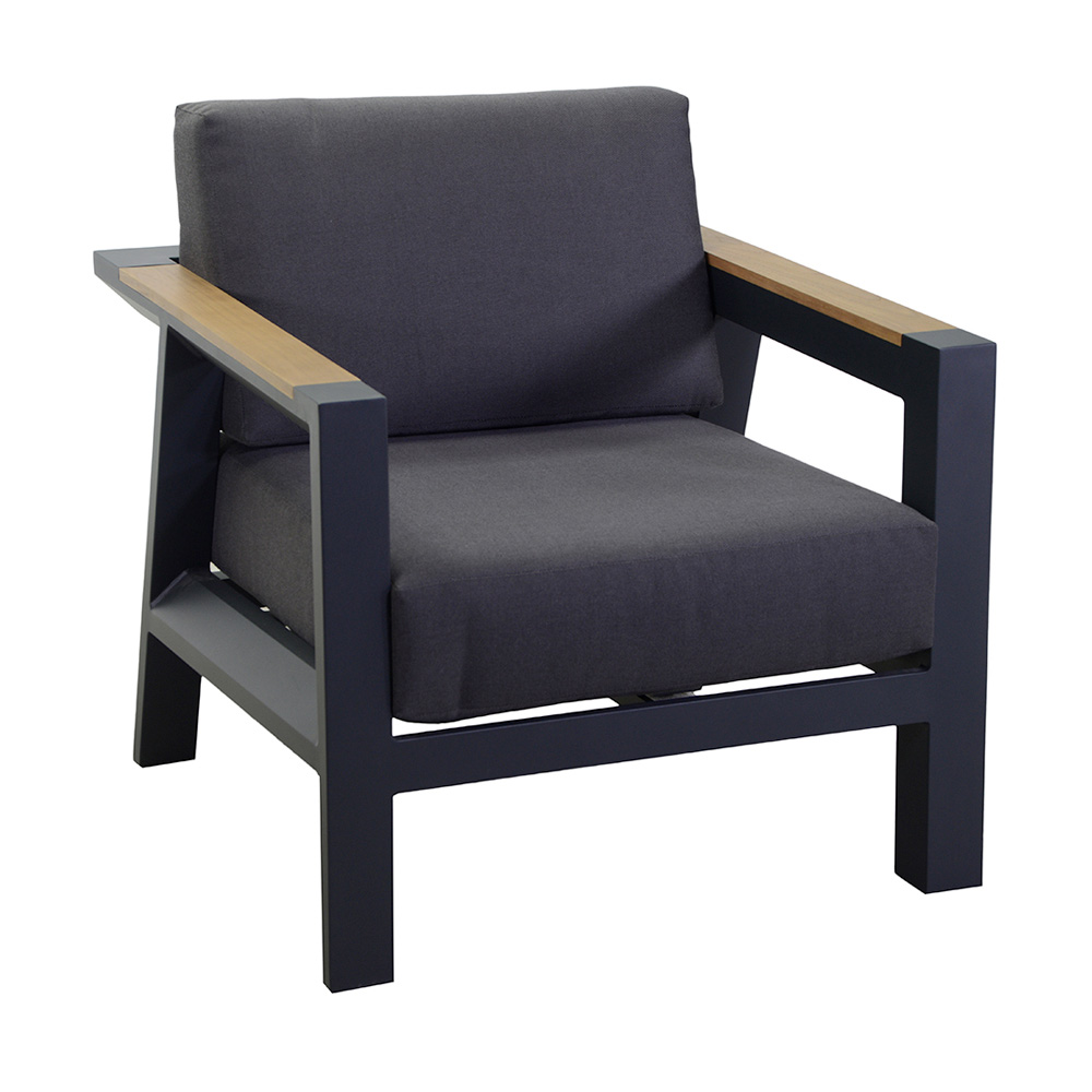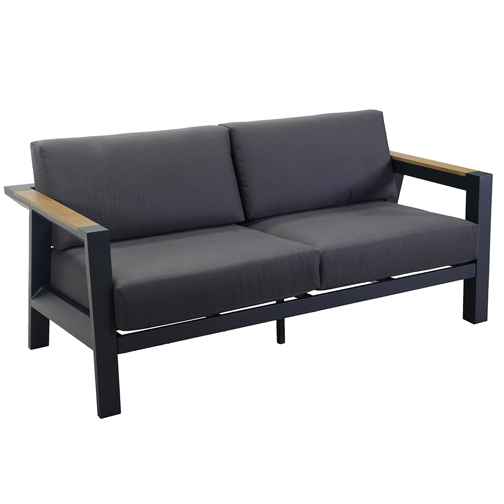 1 pohovky: rám z nerezavějícího práškově lakovaného hliníku v antracitové barvě, voděodolné polštáře z tmavě šedého polyesteru, snímatelné potahy a područky z brazilského dřeva TEAK
