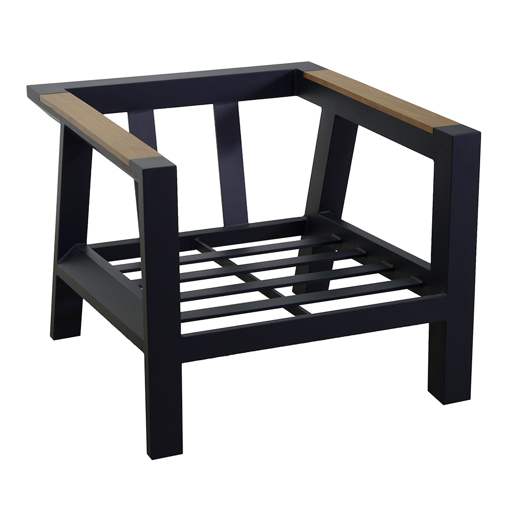 2 křesel: 1 konferenční stolek: rám z nerezavějícího práškově lakovaného hliníku v antracitové barvě, polštáře z tmavě šedého polyesteru odpuzující vodu, snímatelné potahy a područky ze dřeva TEAK z Brazílie