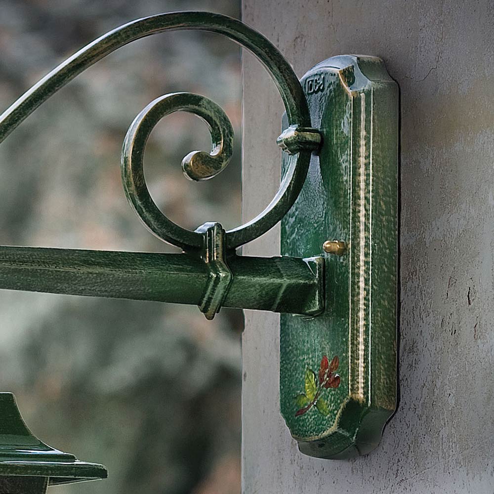 Toto venkovní nástěnné svítidlo je celé vyrobeno ze zeleného hliníku se zlatým stínidlem zdobeným ručně malovanými květinami pro klasický a harmonický styl mezi tvarem a barvami.