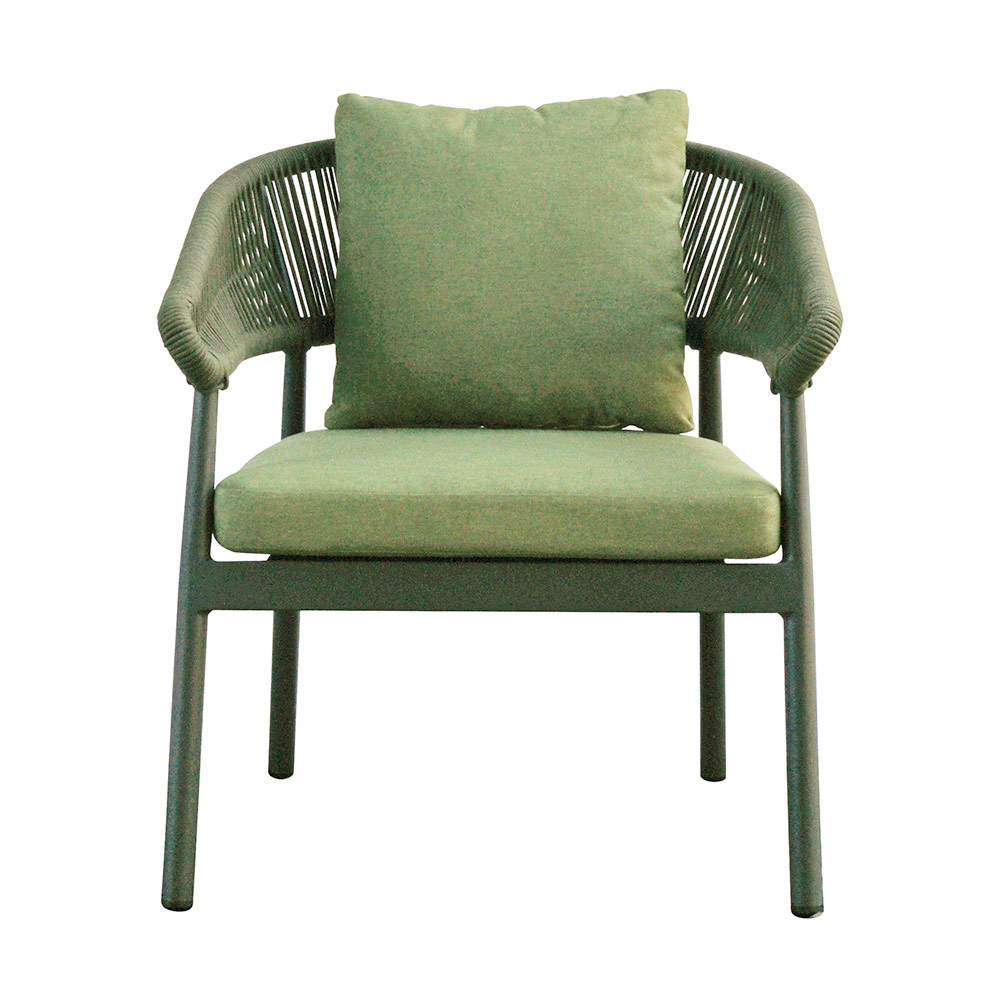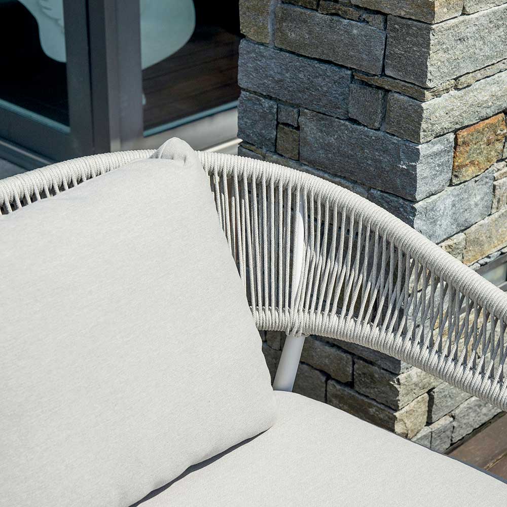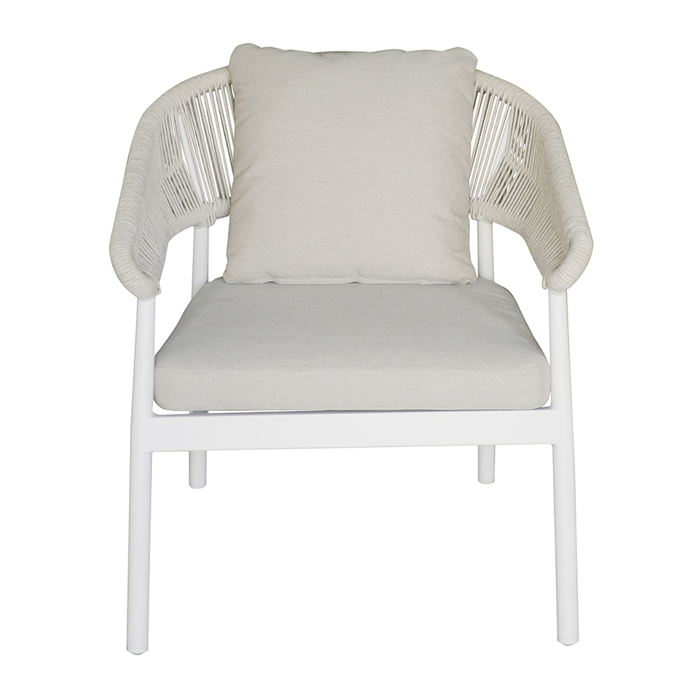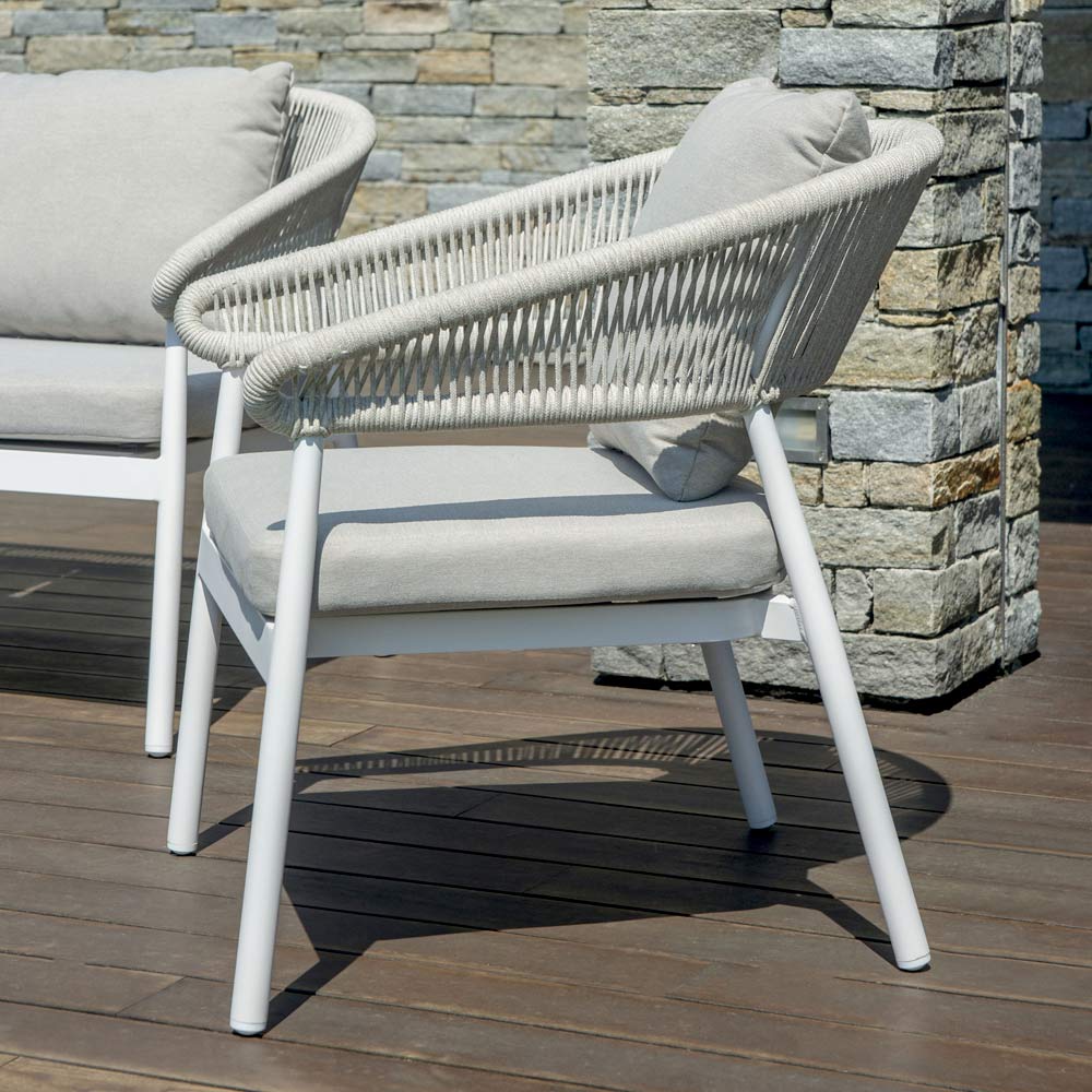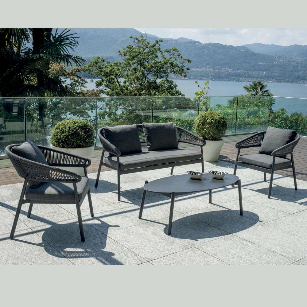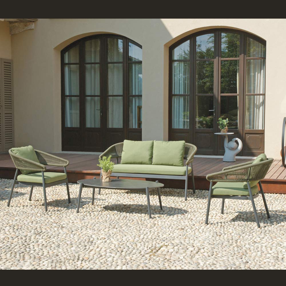 Tento zahradní obývací pokoj je ideálním řešením pro ty, kteří hledají dokonalou rovnováhu mezi elegancí a pohodlím. Tato souprava, která se skládá z křesel a pohovky s čalouněnými polštáři a robustním konferenčním stolkem, je ideálním doplňkem pro příjemné chvíle odpočinku venku. Moderní design a čisté linie se dokonale hodí do každého venkovního prostředí, od prostorných teras až po útulné zahrady.