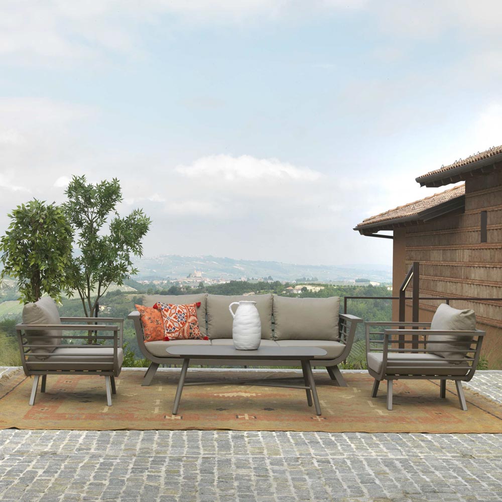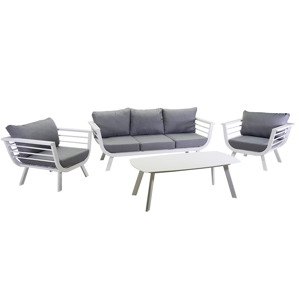 Tato elegantní hliníková souprava pro zahradní posezení je ideální volbou pro ty, kteří hledají styl a pohodlí . Souprava se skládá z třímístné pohovky , dvou křesel a kavárenského stolku , vše obohacené polštářky, které zaručují velmi pohodlné sezení. Tato obývací sestava, která je ideální pro chvíle odpočinku na vaší zahradě nebo terase, v sobě spojuje vytříbený design a funkčnost , čímž vytváří příjemnou a relaxační atmosféru.
