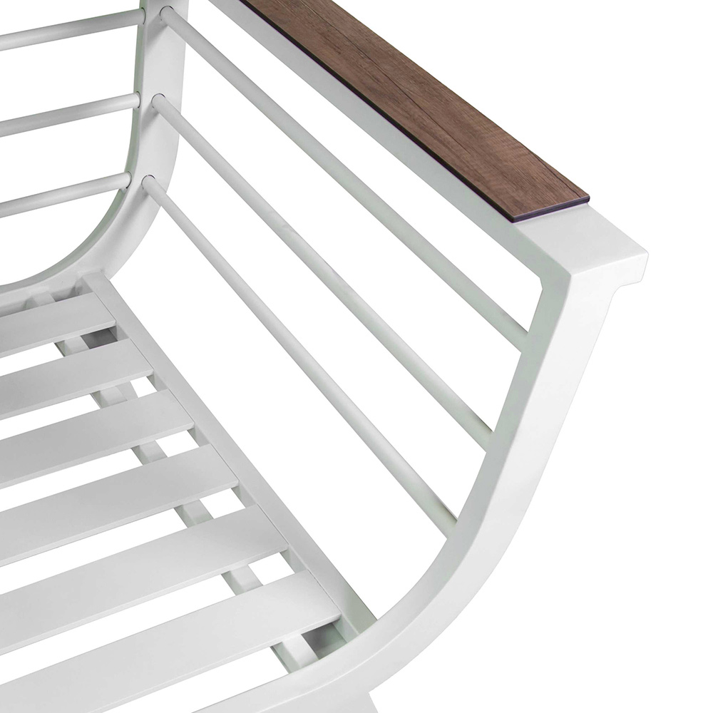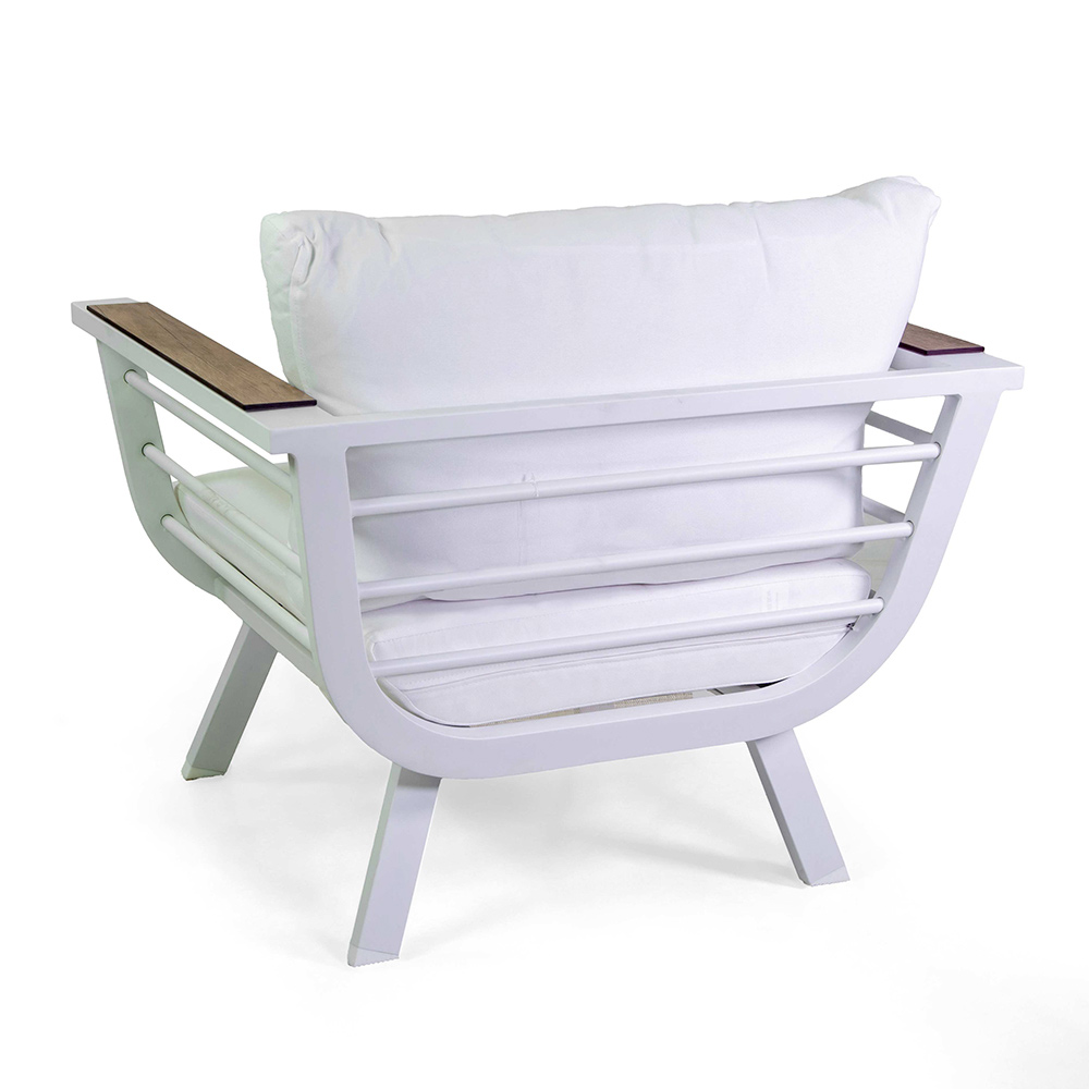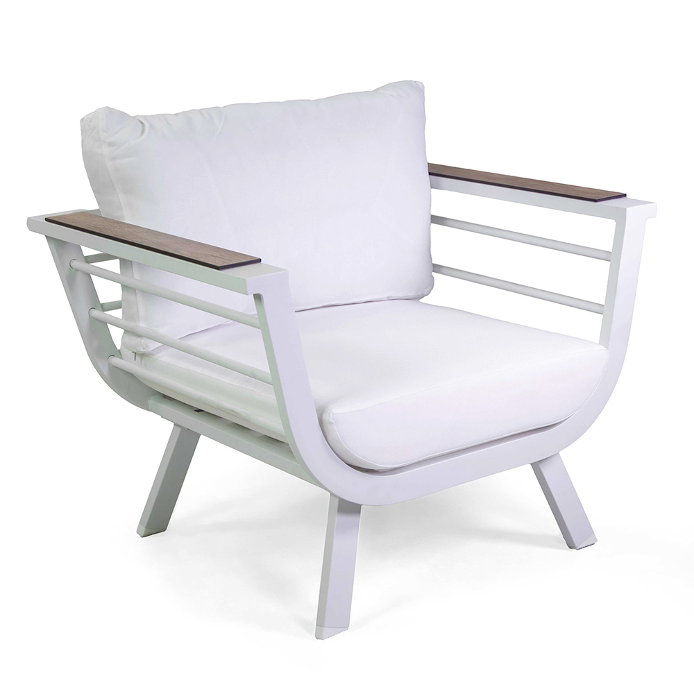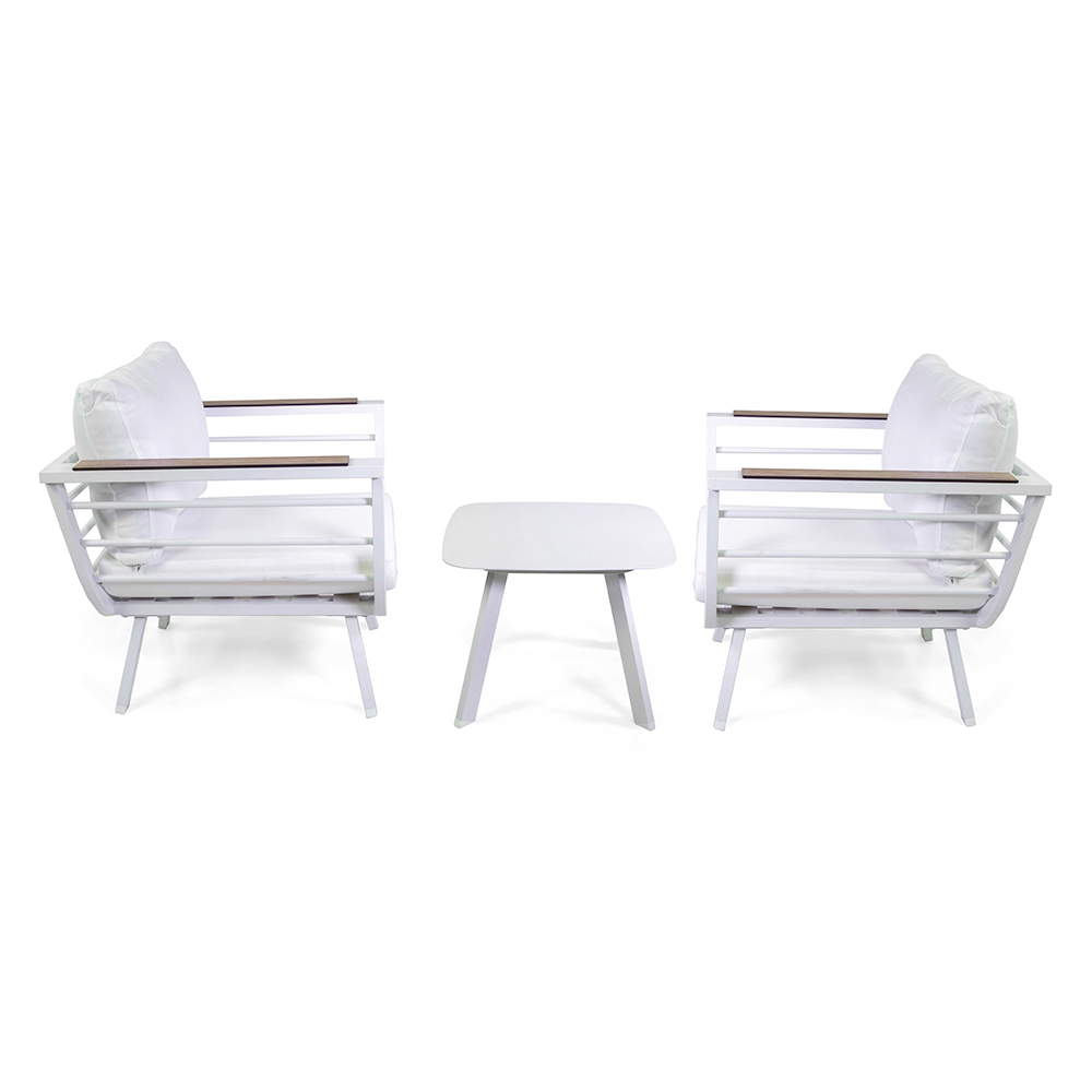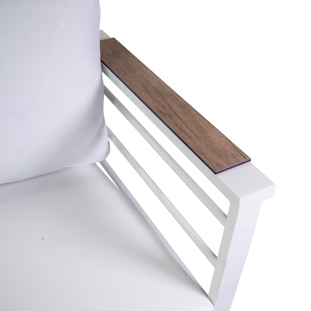 Objevte moderní eleganci a pohodlí s touto bílou práškově lakovanou hliníkovou obývací sestavou . Tato souprava, která je ideální pro dodání nádechu třídy vašemu venkovnímu prostoru, obsahuje dvě křesla s 12 cm silnými odnímatelnými polštáři ze 100% vodoodpudivé tkaniny Olifen, která zajišťuje pohodlí a odolnost. Vložky HPL područek dodávají styl a praktičnost, zatímco bílý hliníkový stůl je robustní a snadno se udržuje.