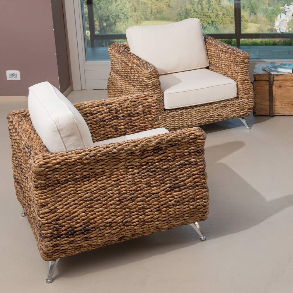 Venkovní lounge skládající se ze 2 křesel , třímístné pohovky a kavárenského stolku-poufu z přírodního ručně tkaného banánovníku se standardními polštáři včetně v standardním " Ecru " provedení.