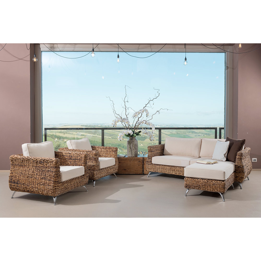 obývací pokoj patří do celé kolekce, která vyniká moderními tóny jak v designu sedáků, tak v detailu hliníkových nohou . Zároveň ji však oživuje hřejivost přírodního výpletu , ručně vyrobeného pomocí rafinovaného přírodního banánového výpletu.