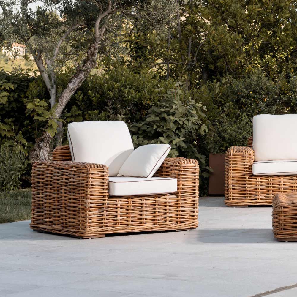 Venkovní ratanová sedací souprava z přírodního ratanu s polštáři v ceně