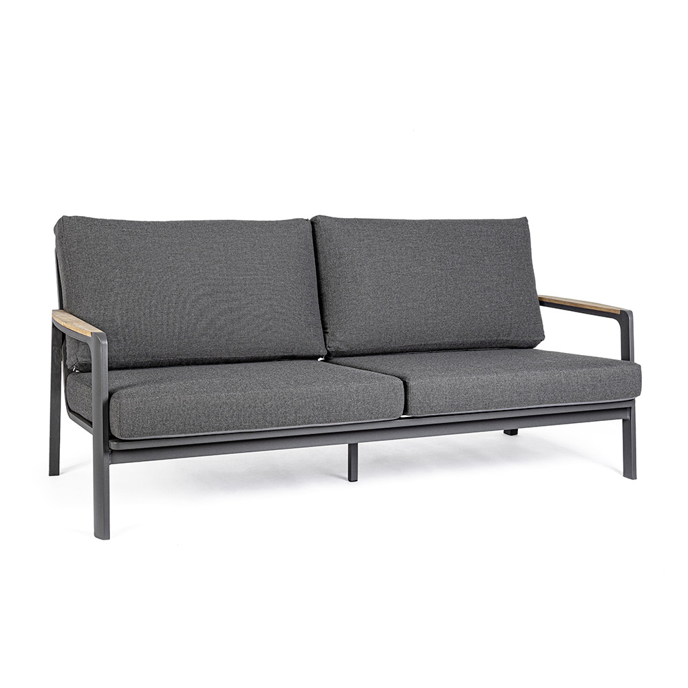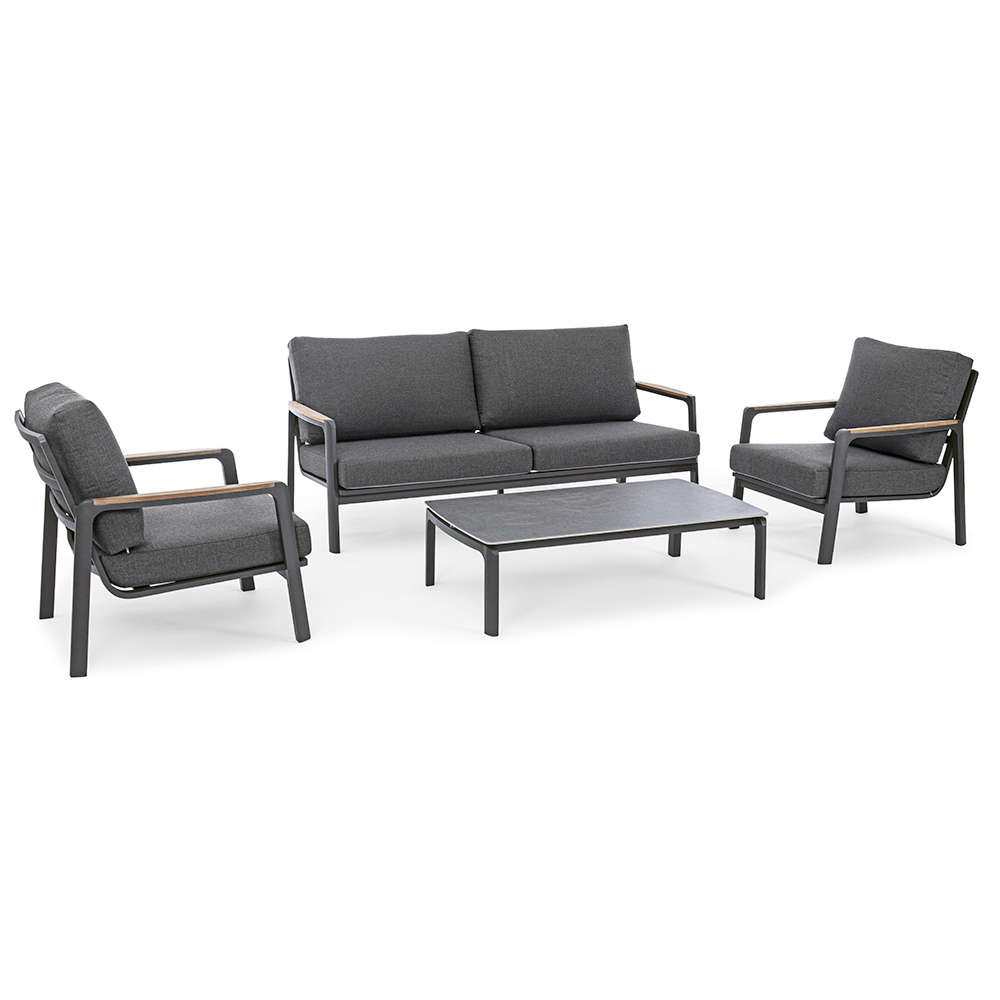Práškově lakovaná hliníková konstrukce (polyester). Područky s teakovými vložkami. Sedáky a opěradla s odnímatelnými potahy akrylovou látkou.