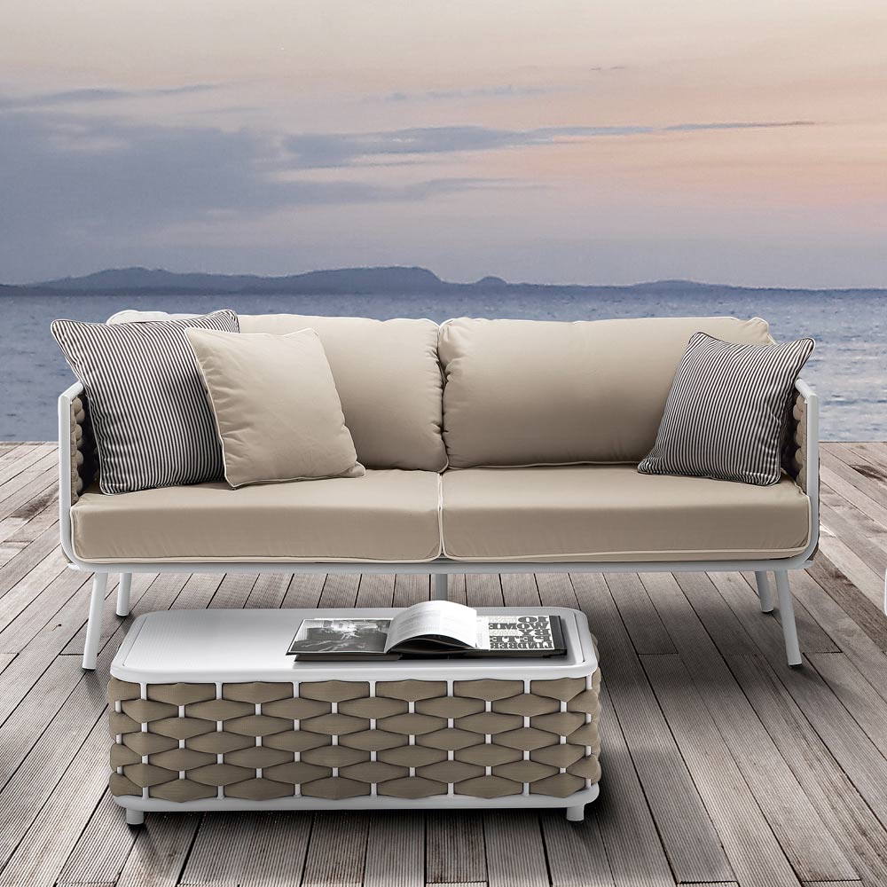 Konstrukce této pohovky je snadno ovladatelná a pevná, ale zároveň si zachovává čistý design. Její moderní styl jí dodává výrazný charakter, díky čemuž se skvěle hodí pro vybavení venkovních prostor jak v soukromém, tak ve smluvním prostředí.