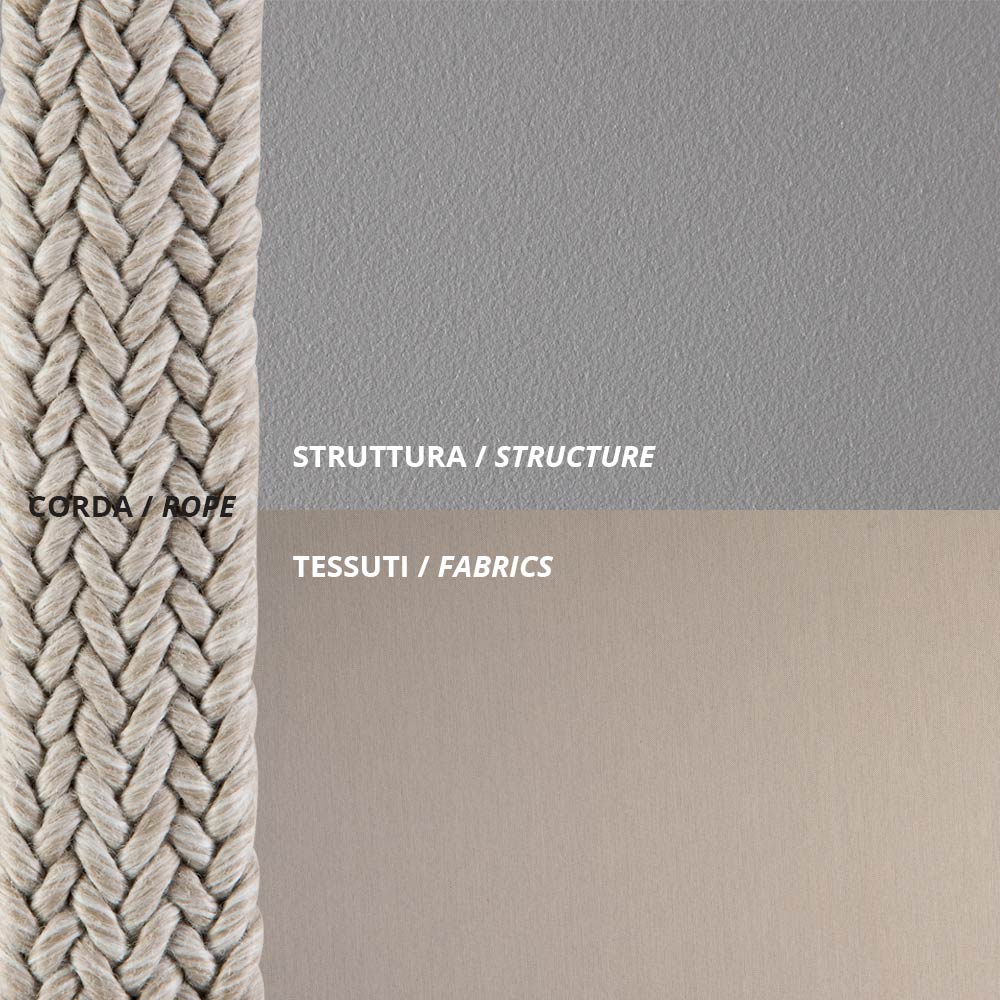 Střízlivé linie a materiály nejnovější generace se perfektně kombinují s jakýmkoli stylem nábytku a přizpůsobí se jakémukoli kontextu. Lanový prvek loketní opěrky dodává tomuto kusu nábytku další originalitu.