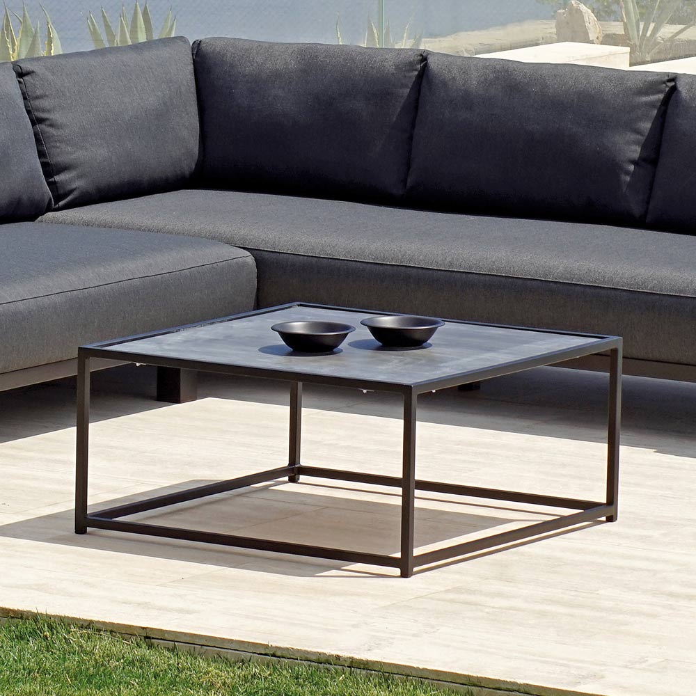 Zahradní salonek se 2 pohovkami, černou hliníkovou konstrukcí a keramickým konferenčním stolkem.