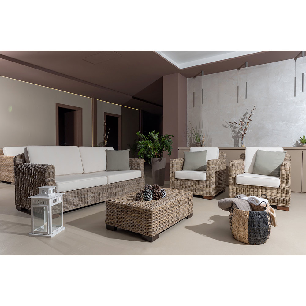 Zahradní obývací sestava skládající se ze 2 křesel , 3místné pohovky a pouf-stolu z ručně tkaného šedého kubu se standardními polštáři v ceně ve standardním " Ecru " povrchu .