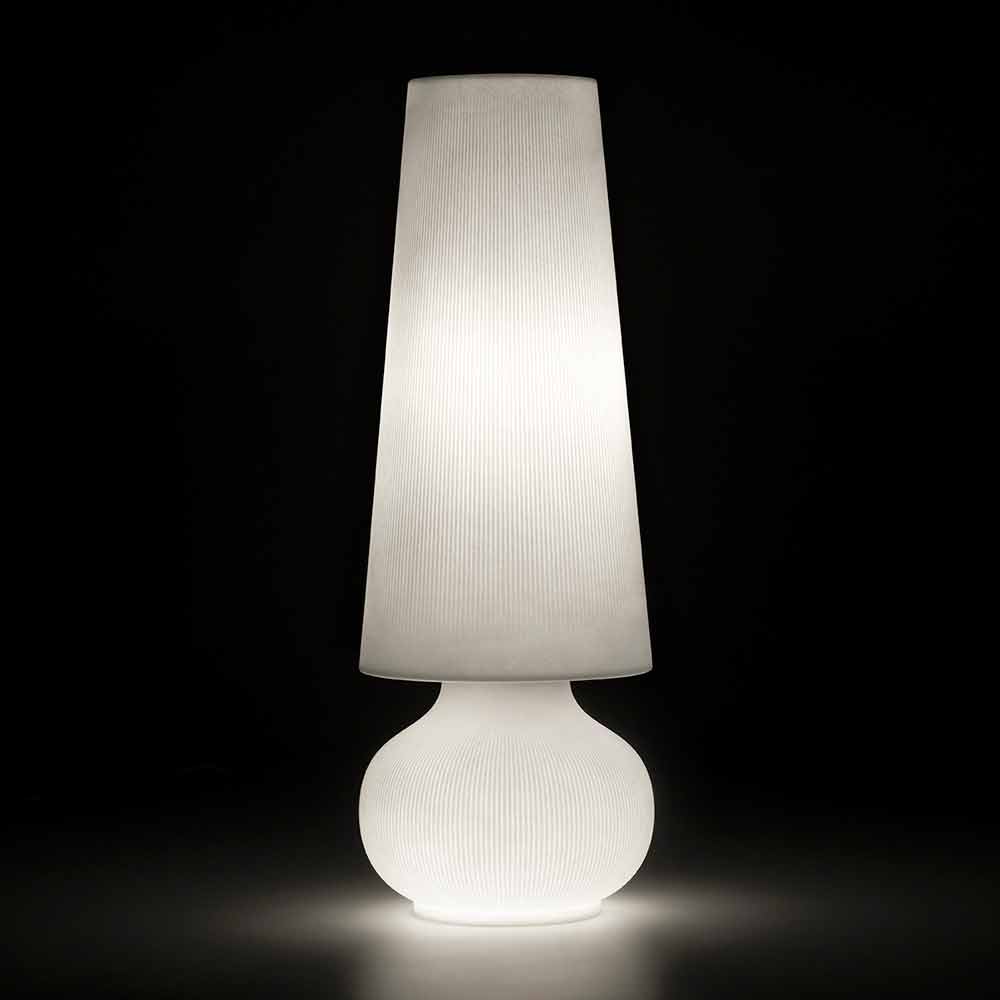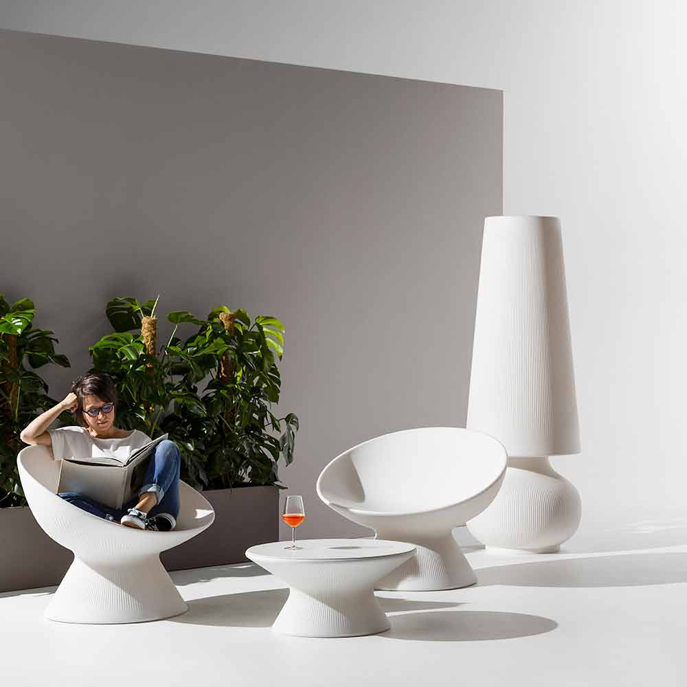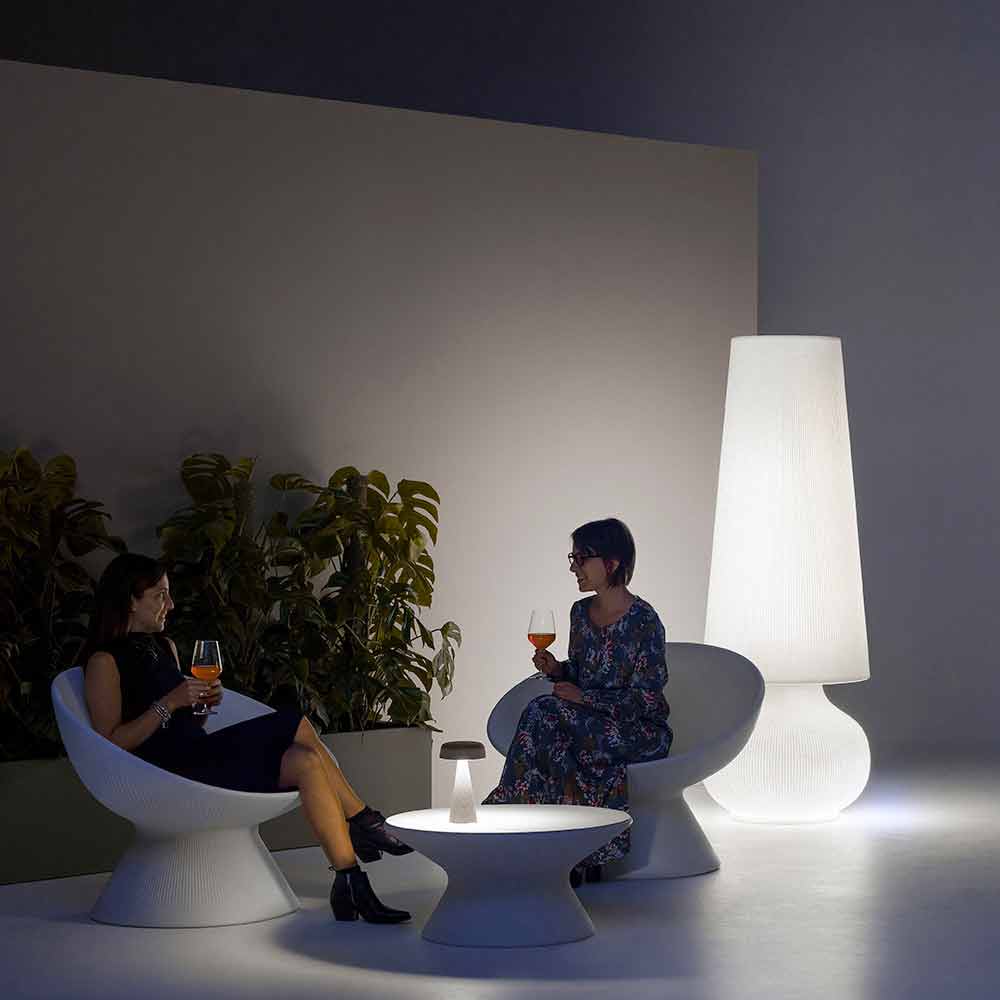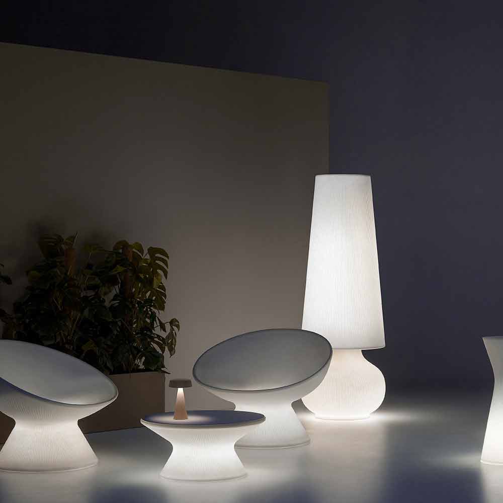 Stojací lampa pro vybavení venkovních prostor vyrobených v Itálii v bílém polyethylenu. Tato lampa se sochařským vzhledem se vyznačuje elegantním a moderním designem a je dokonalým zařízením pro venkovní prostředí, jako jsou zahrady a terasy nebo smluvní prostory, kde je nutné obohatit estetiku o inovativní a originální nádech.