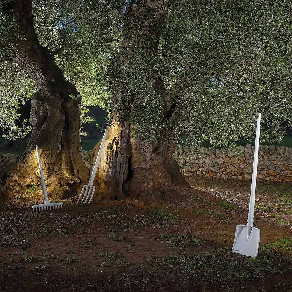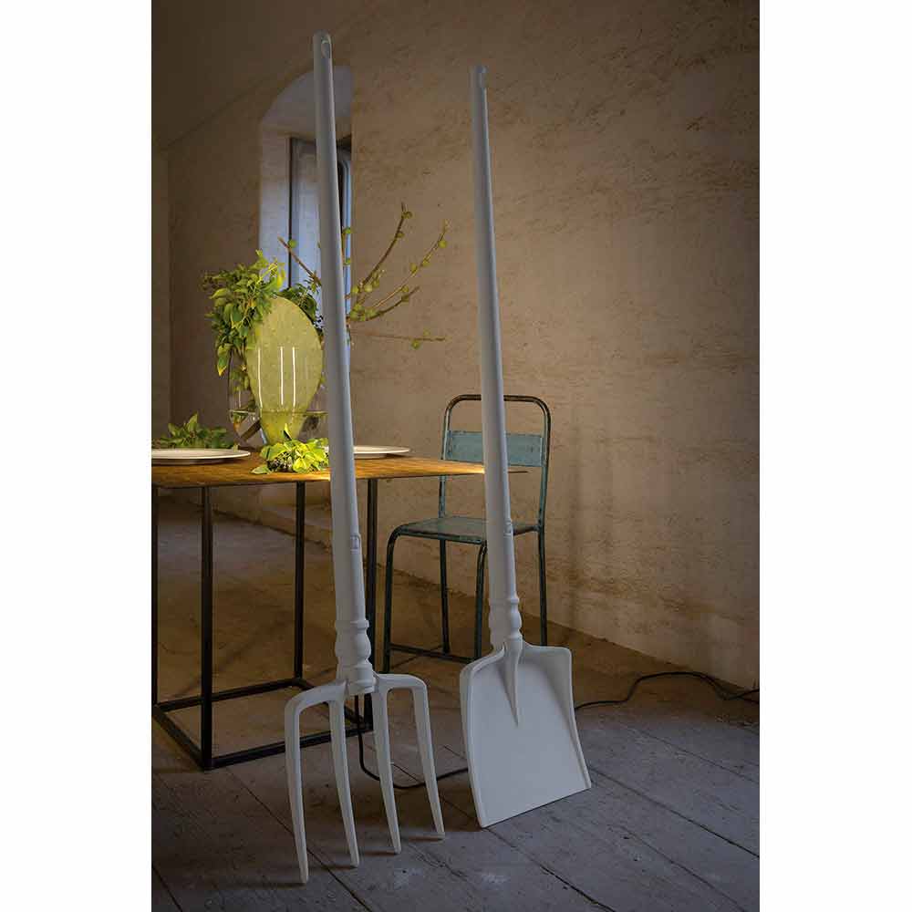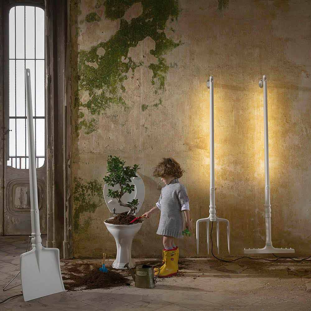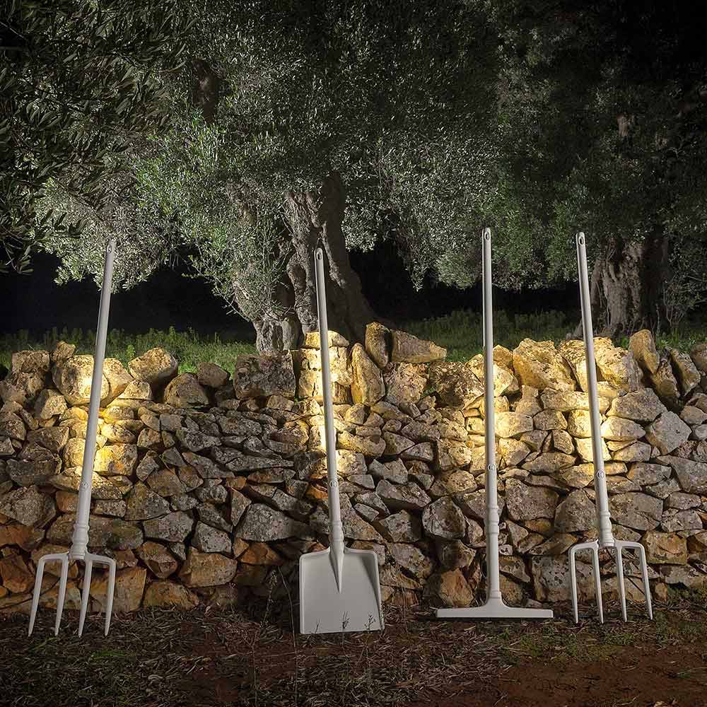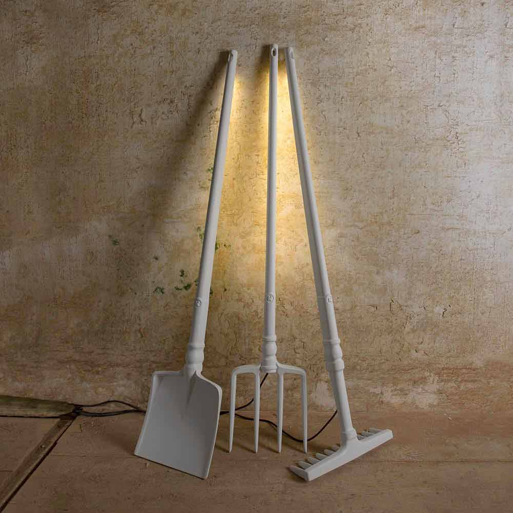 Tato originální a jedinečná venkovní stojací lampa je vyrobena ve 3 různých tvarech, aby nám připomněla nástroje, které se v dnešní době používají stále méně: vidle, lopatu a hrábě.