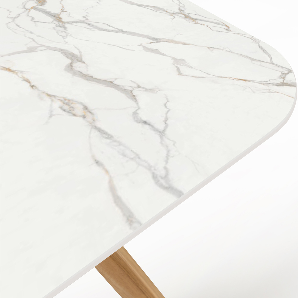 vyrobený v Itálii. Tento venkovní stůl s keramickou deskou Calacatta Oro je poctou nadčasové eleganci a decentnímu luxusu. Kombinuje teplou a příjemnou dřevěnou podnož s keramickou deskou, která dokonale napodobuje mramor Calacatta Oro, známý svým jedinečným zlatým žilkováním na bílém pozadí.