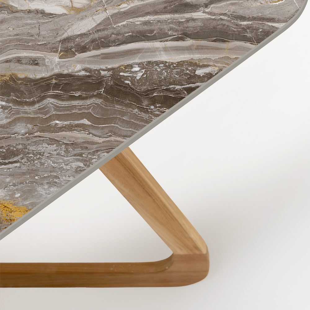 vyrobený v Itálii. Tento venkovní stůl je designovým zázrakem, který kombinuje pevnost dřeva s opulentností keramiky, inspirované mramorem Orobico Luxe . Tato keramická deska s odstíny šedé a třpytivými zlatými žilkami odráží krásu a složitost přírodních skalních útvarů a dodává vašemu venkovnímu prostoru nádech sofistikovaného luxusu .