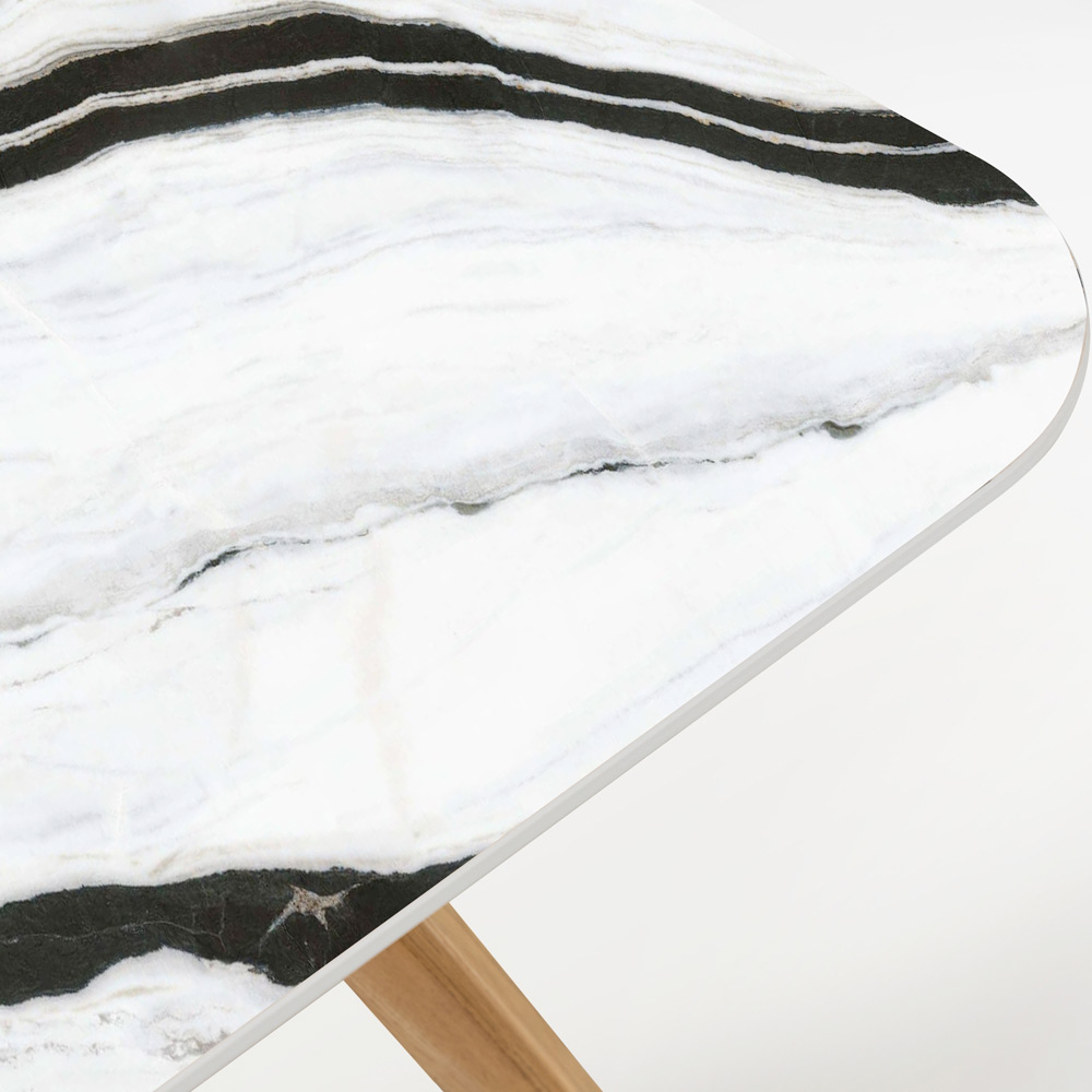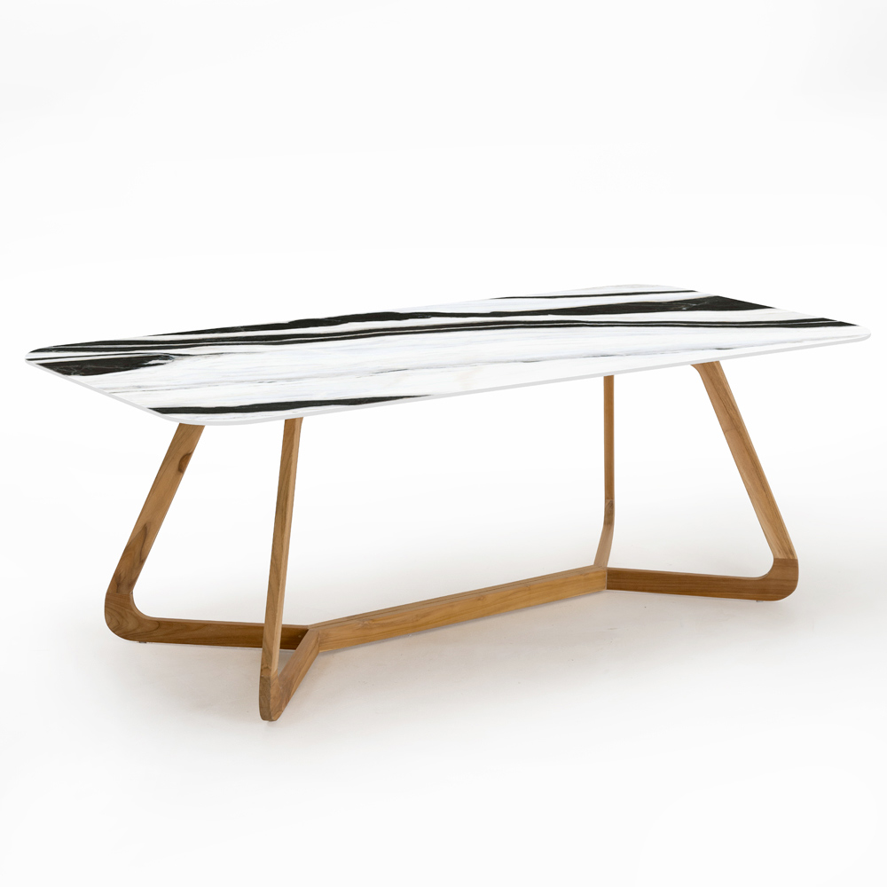 vyrobený v Itálii. Tento venkovní stůl je skutečným mistrovským dílem designu, které kombinuje teplo dřeva s elegantní čistotou keramiky Panda White . Tato výrazná deska stolu s výraznou černou texturou na čistě bílém pozadí je nejen vizuálně poutavá, ale také neuvěřitelně odolná a snadno se udržuje, takže se perfektně hodí do jakéhokoli venkovního prostředí.