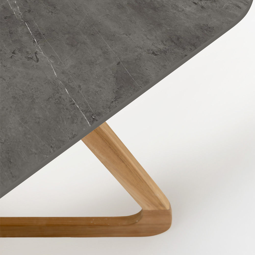 vyrobený v Itálii. Tento venkovní stůl s keramickou deskou v barvě Pietra Grey je vynikající volbou pro ty, kteří hledají jednoduchý, ale působivý design. Stůl kombinuje robustní dřevěnou základnu s keramickou deskou, která dokonale napodobuje eleganci šedého kamene a vyznačuje se jemným bílým žilkováním, které celkovému designu dodává hloubku a charakter.