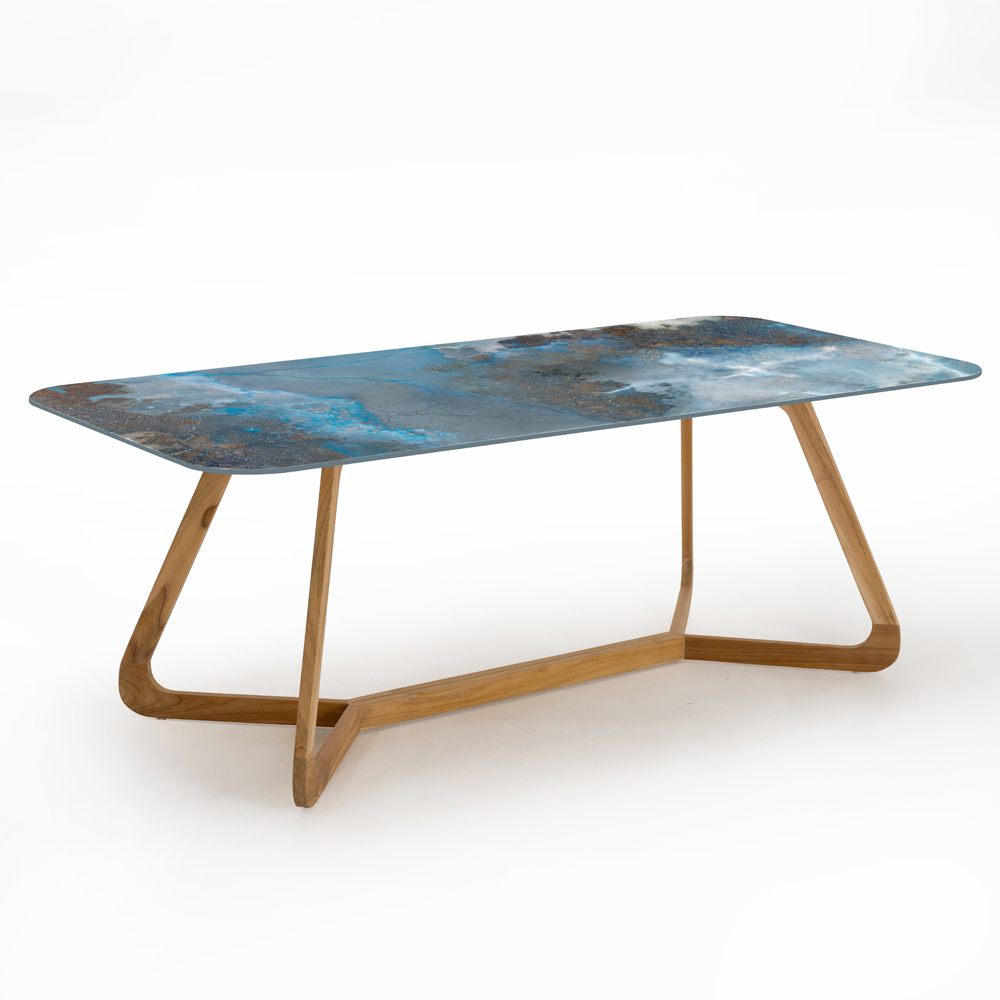vyrobený v Itálii. Tento venkovní stůl je dokonalým spojením přírodní elegance a moderního umění. Deska stolu, vyrobená z vysoce kvalitní keramiky, se vyznačuje jedinečnou povrchovou úpravou, která napodobuje organické textury a zářivé barvy skalního útvaru s odstíny modré, šedé a měděných akcentů. Tento povrch je nejen poutavý, ale také extrémně odolný, ideální pro každodenní venkovní použití.