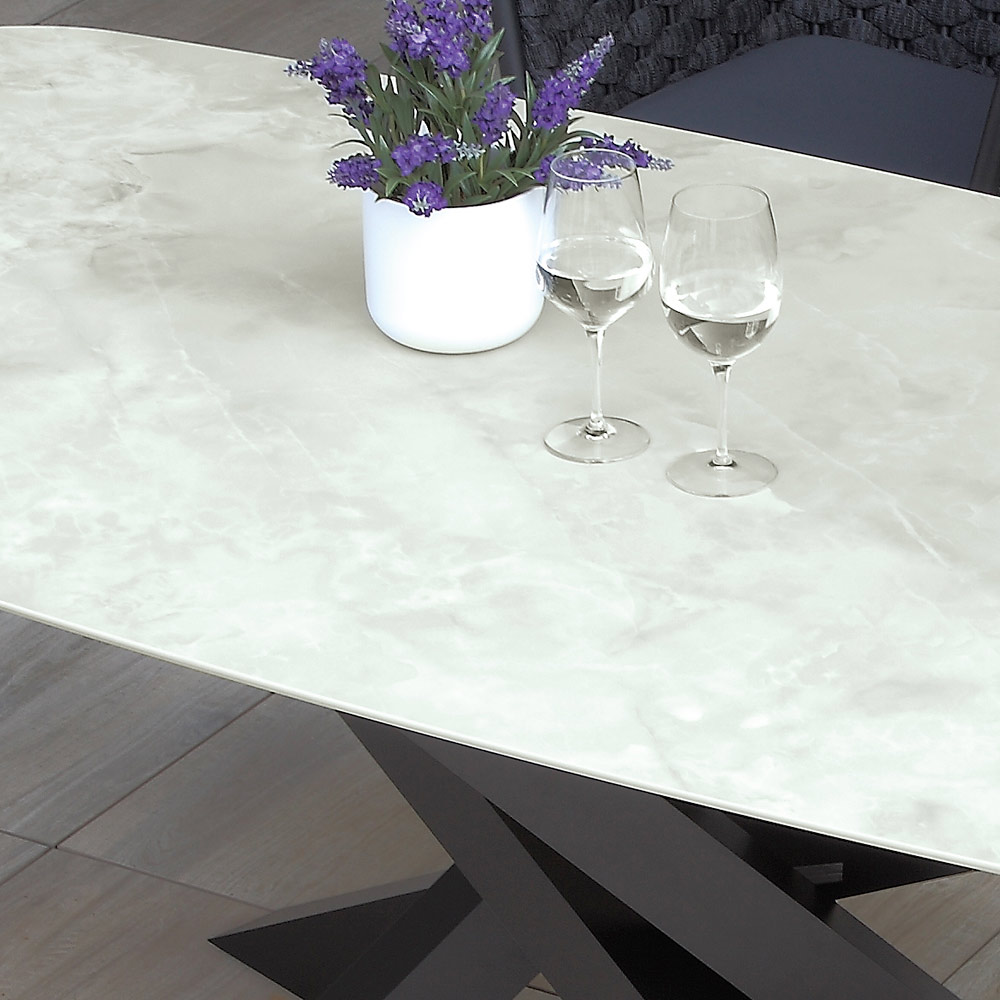 Vrchní deska dodává nádech sofistikovaného jasu a vyniká svou jemnou texturou a zaoblenými hranami, které změkčují geometrii stolu, takže je ideální pro soukromé i smluvní prostředí. Vizuálně nápadná sochařská křížová základna nabízí vynikající stabilitu a extra dávku současné osobnosti .