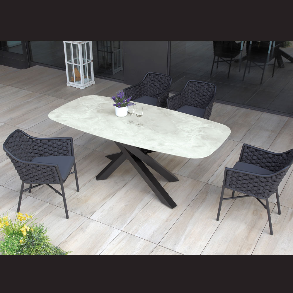 Tento zahradní stůl kombinuje elegantní design a vynikající odolnost a je ideální pro stylové vybavení jakéhokoli venkovního prostředí. Jeho lakovaná hliníková konstrukce, pevná a moderního střihu, je kombinována s rafinovanou deskou z vrstvené HPL , která je známá svou extrémní trvanlivostí a odolností vůči atmosférickým vlivům , poškrábání a teplu.