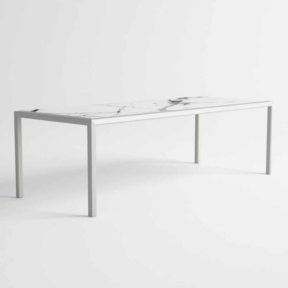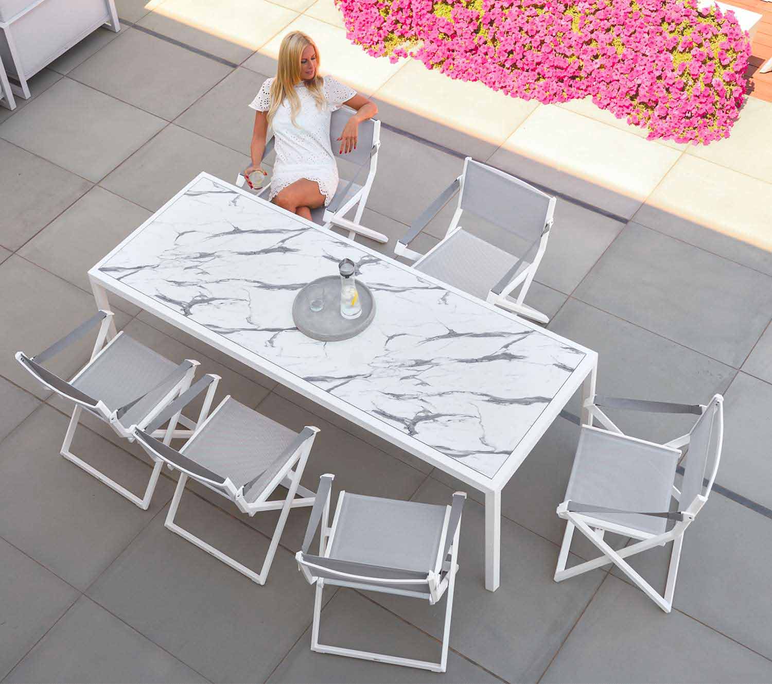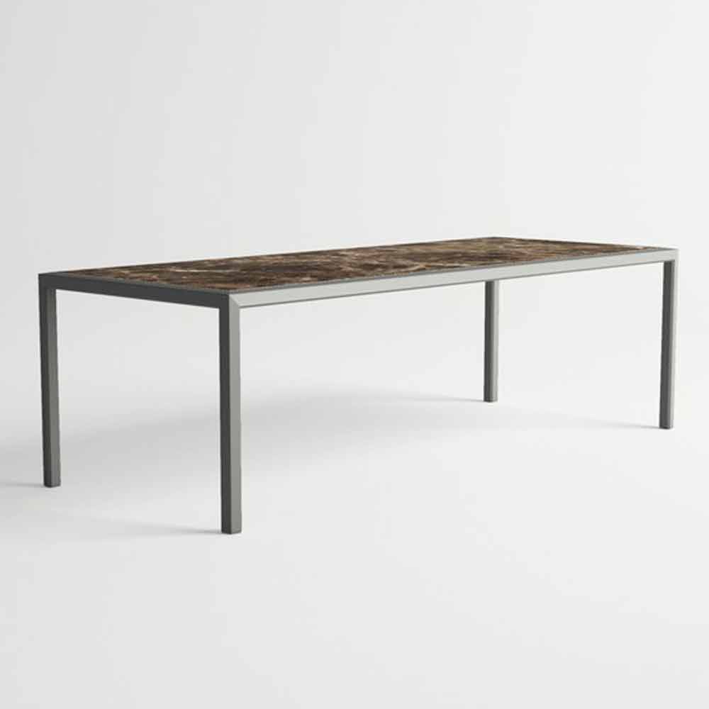 Moderní venkovní stůl, hliníková konstrukce a designová laminovaná horní část HPL.