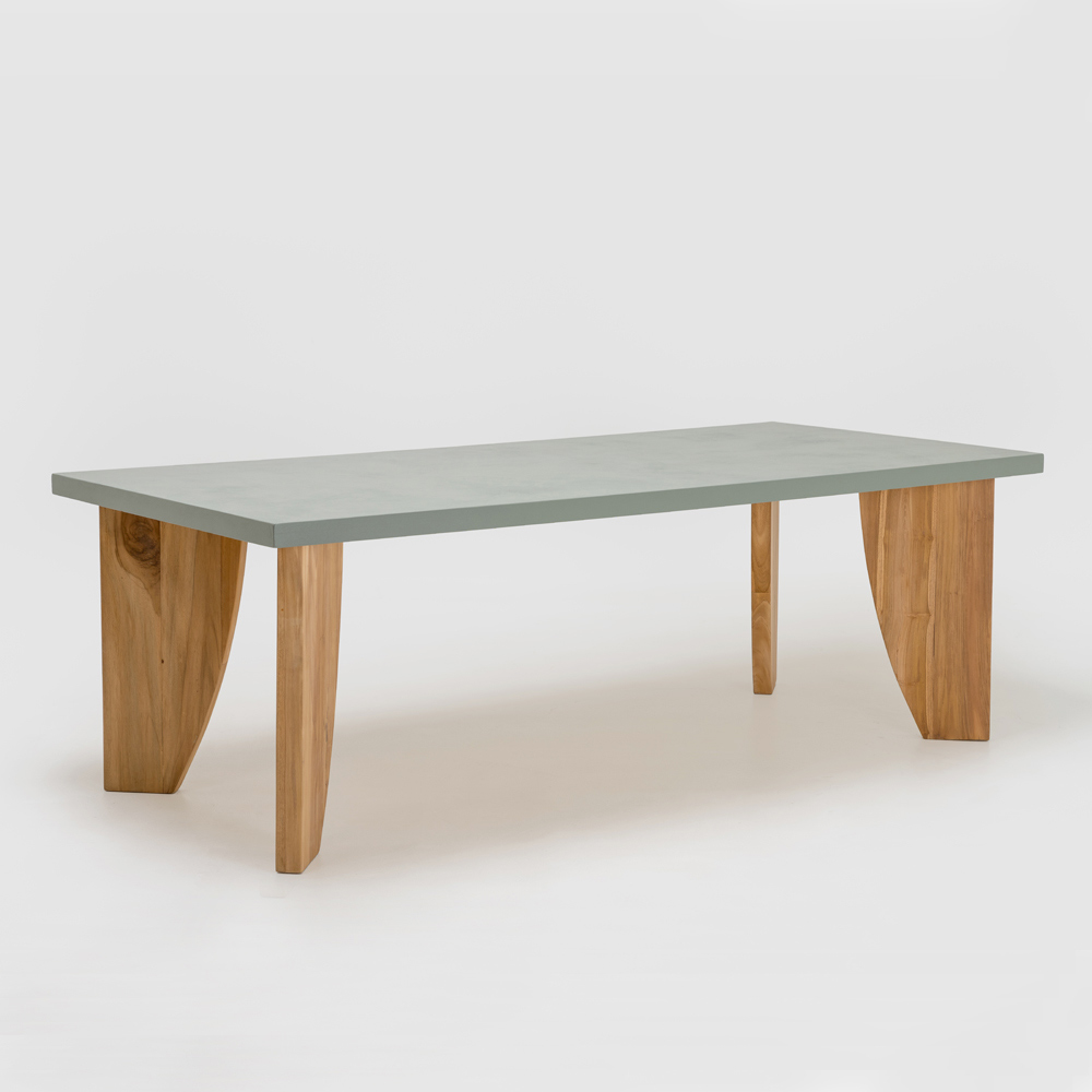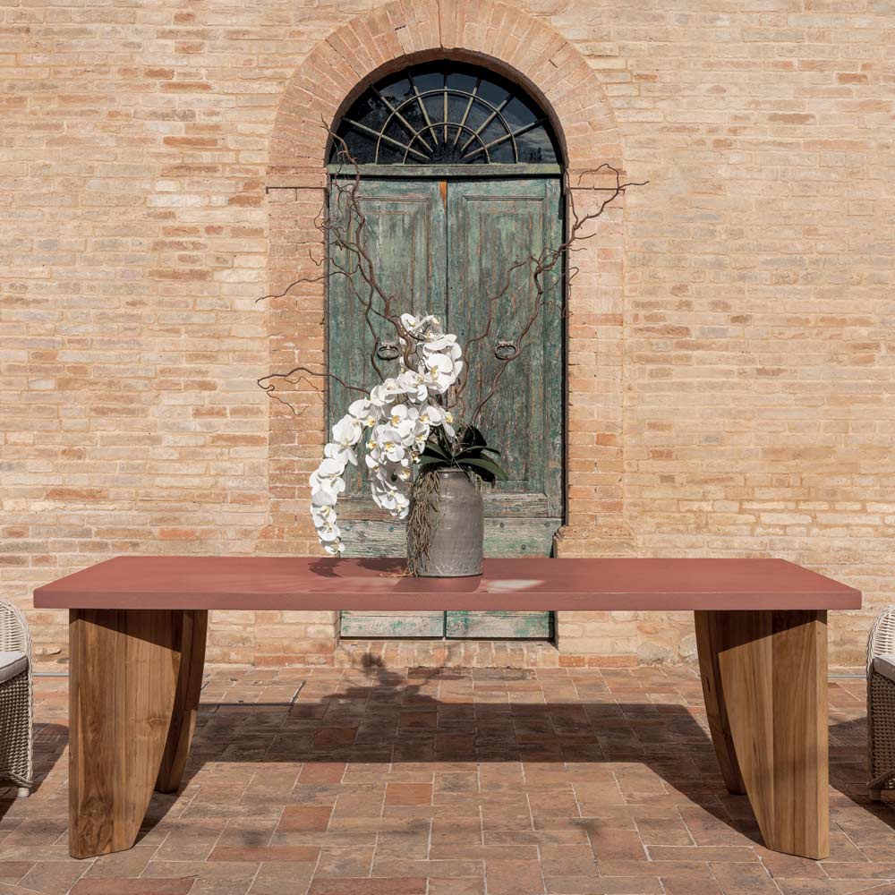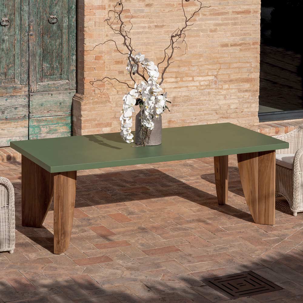 Stůl pro vnitřní i venkovní použití z mořské překližky okumé a teakového dřeva. Vyrobeno v Itálii.